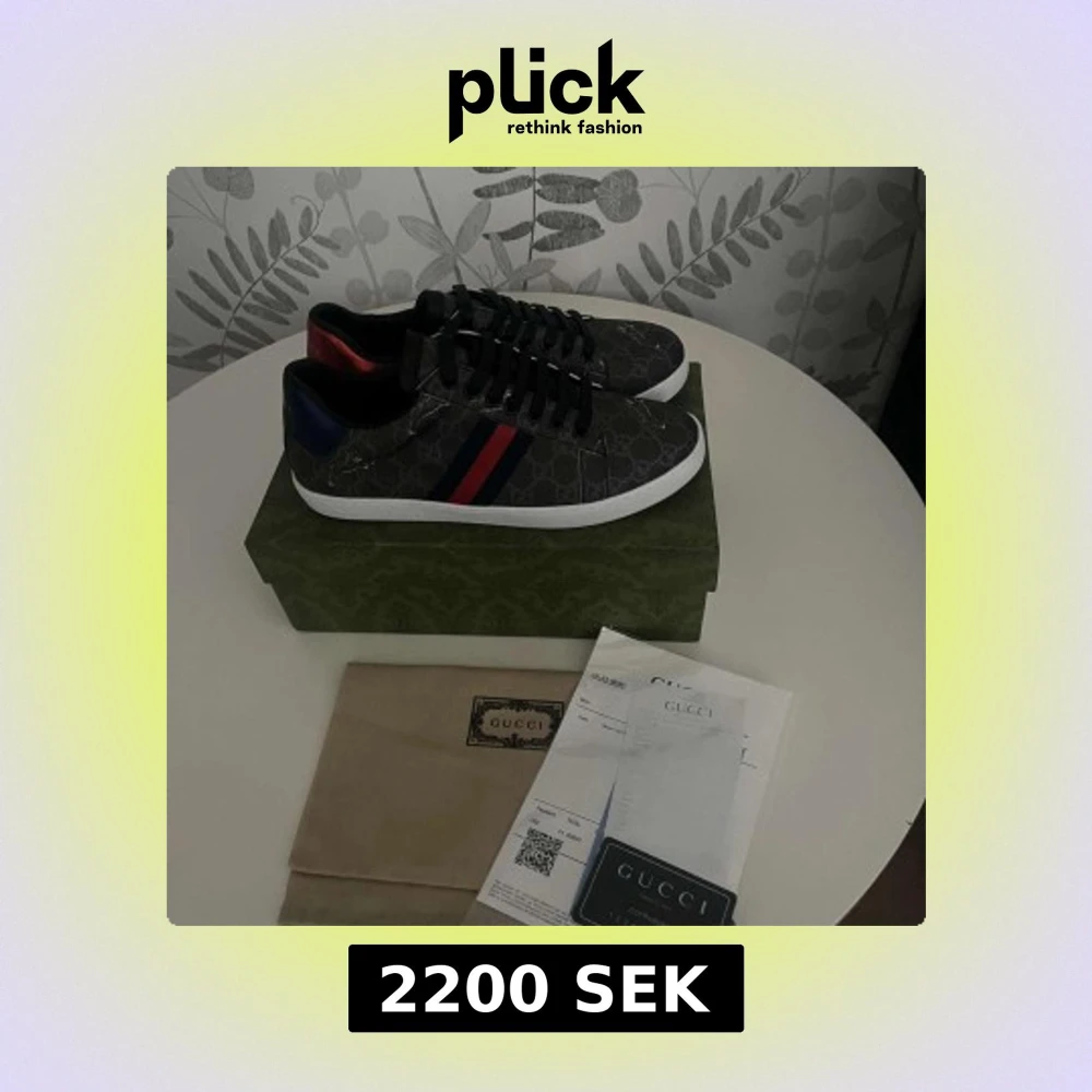 Säljer ett par snygga Gucci sneakers i svart med klassiskt monogrammönster och röd/blå rand på sidan. Skorna har vit platt sula, svarta skosnören och detaljer i rött och blått på hälen. Perfekta för dig som vill sticka ut med stil. OBS! PRISET KAN DISKUTERAS VID EN SNABB AFFÄR!