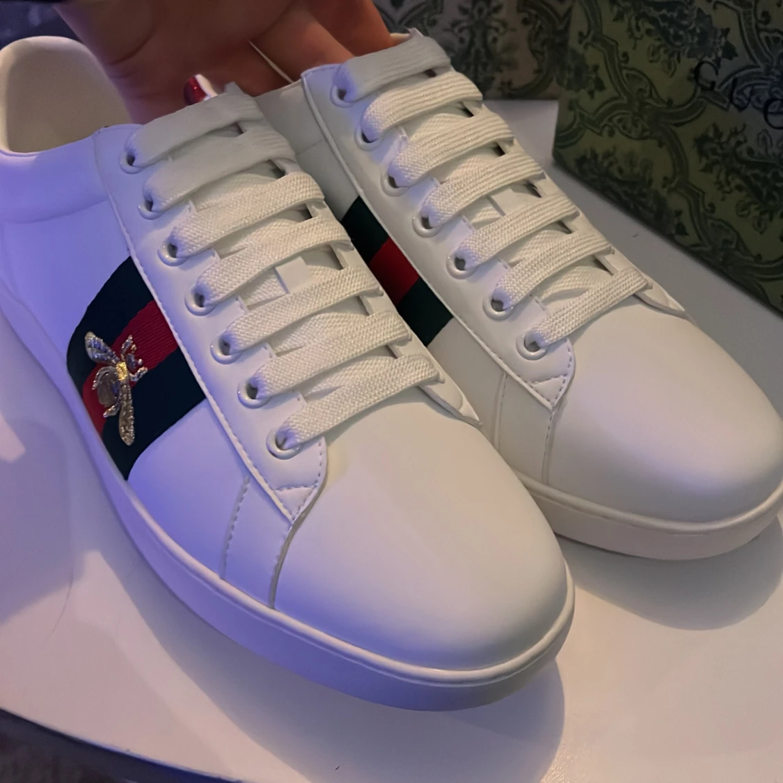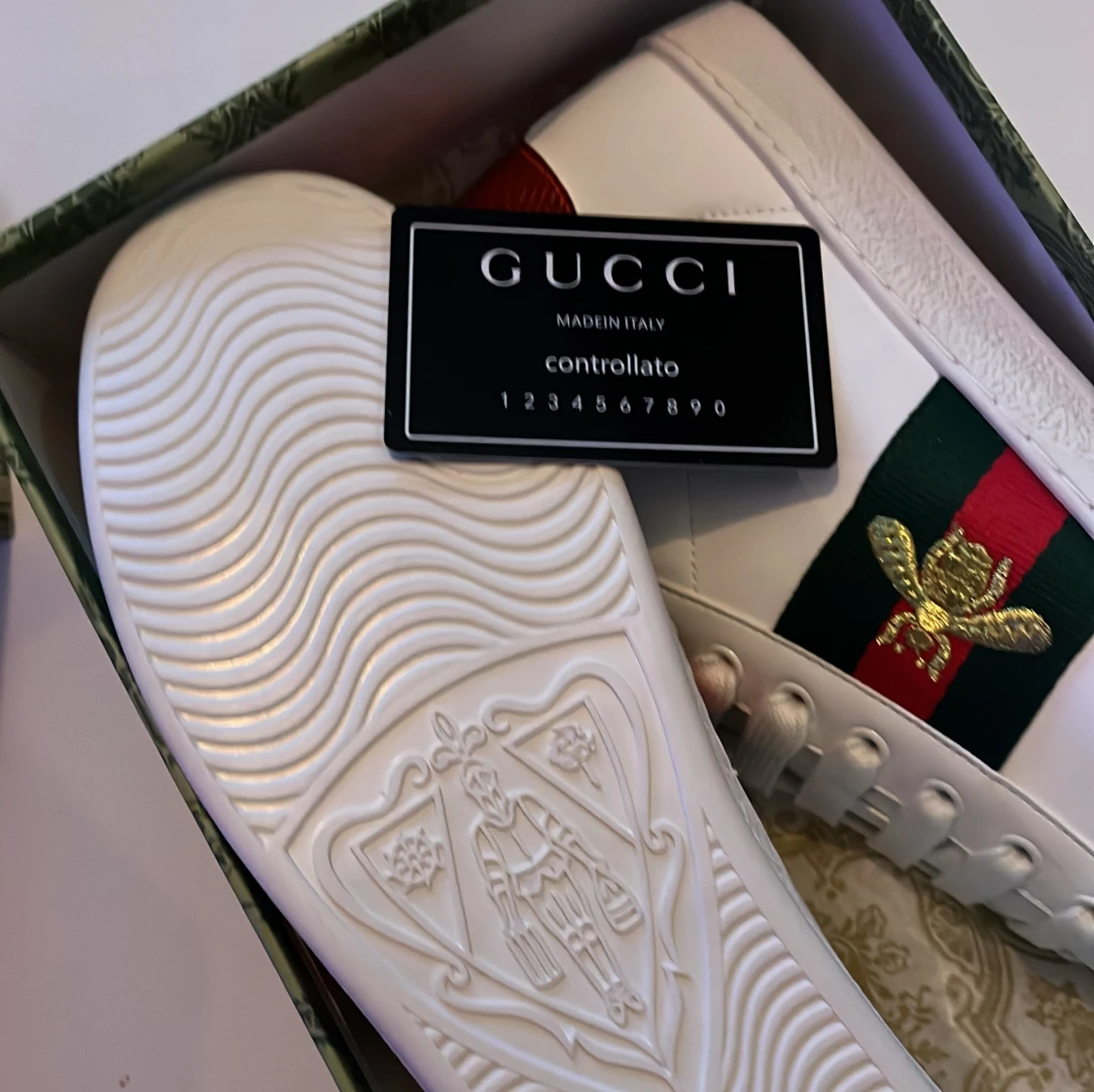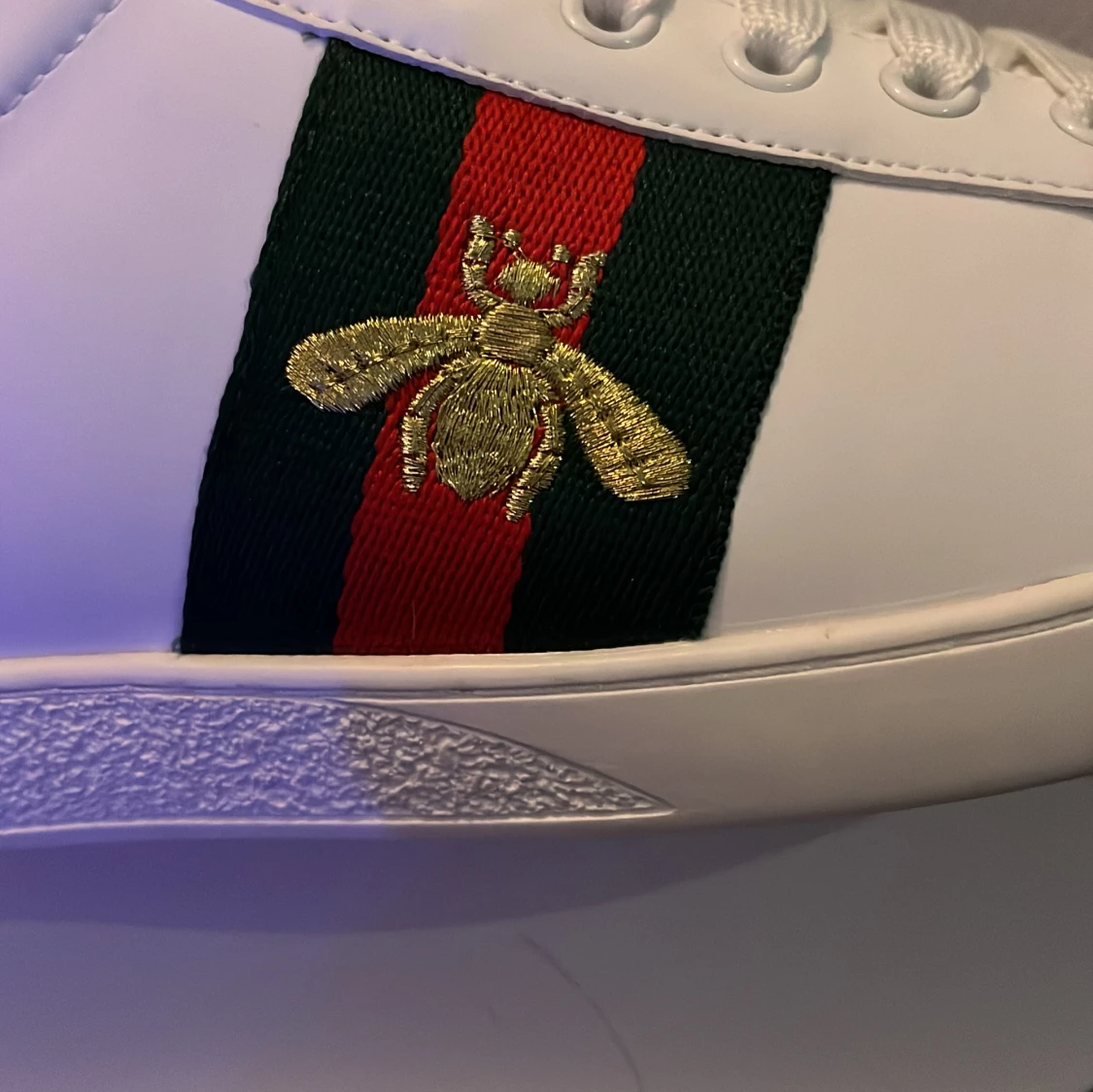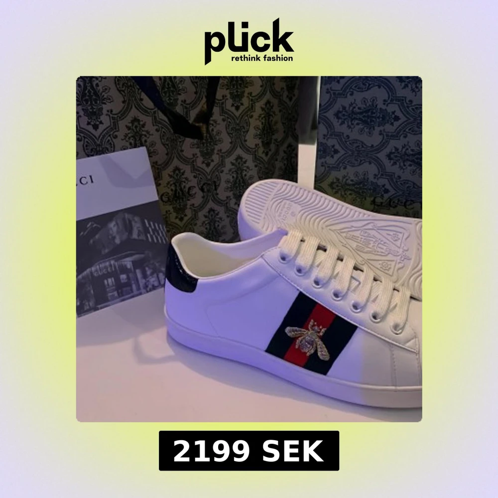 Gucci Ace skor. Bra skick. Original storlek 42 men passar någon som har 43 (sitter ganska tight) Passar 42-42.5 bekvämt. allt på bilden kommer med. bara skriv vid funderingar. skorna är helt nya. Kan sänka priset vid snabb affär 👌