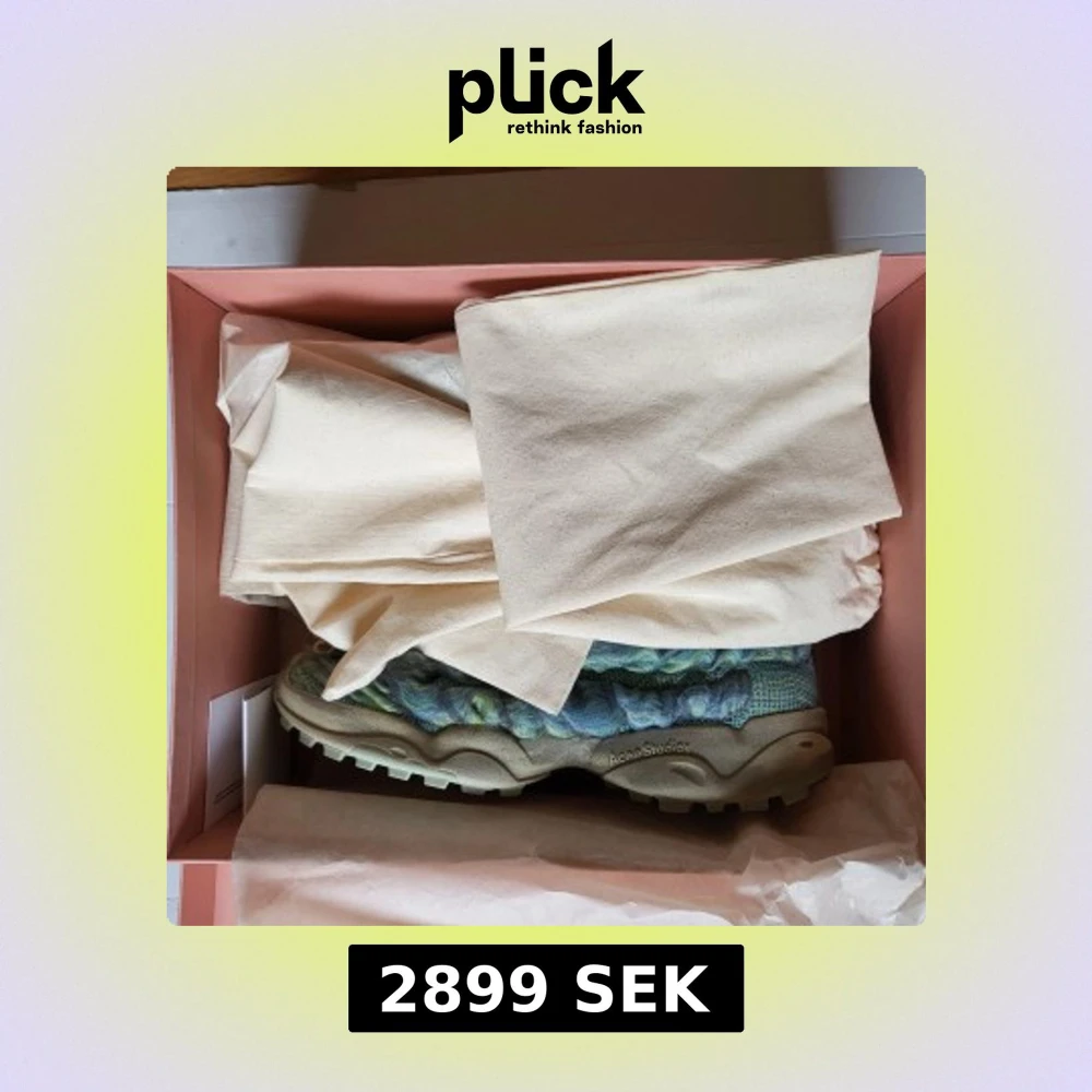 Helt nya unika sneakers från Acne Studios med chunky sula och coolt blågrönt mönster. Ovandelen är stickad i flera nyanser av blått, grönt och grått, med beige snörning och detaljer. Snygg textur och robust yttersula för extra attityd.