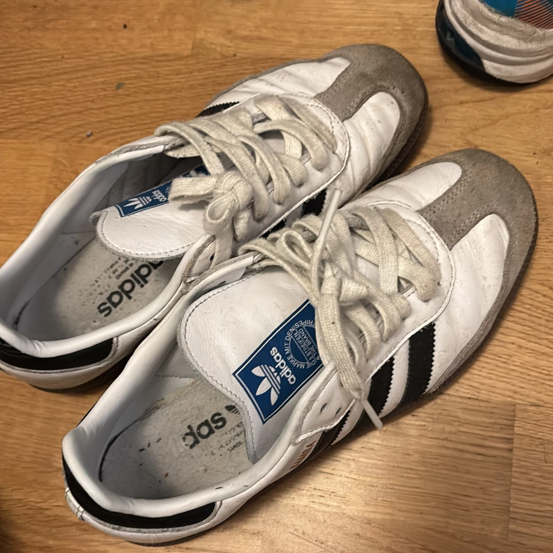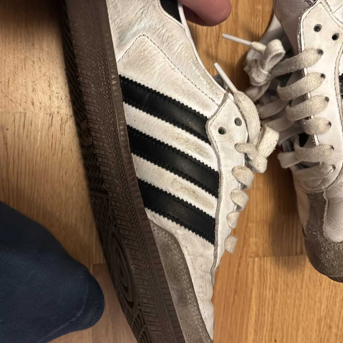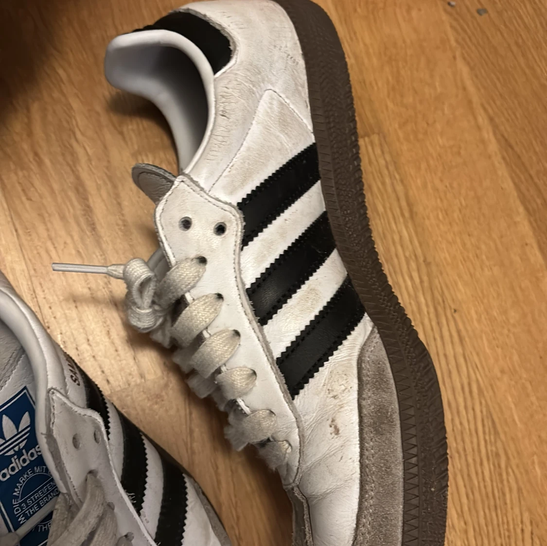 Klassiska Adidas Samba sneakers i vitt och svart med snörning. Skorna har en stilren design med de ikoniska tre ränderna på sidan och en brun sula. Perfekta för en sportig look. Skriv innan ni köper