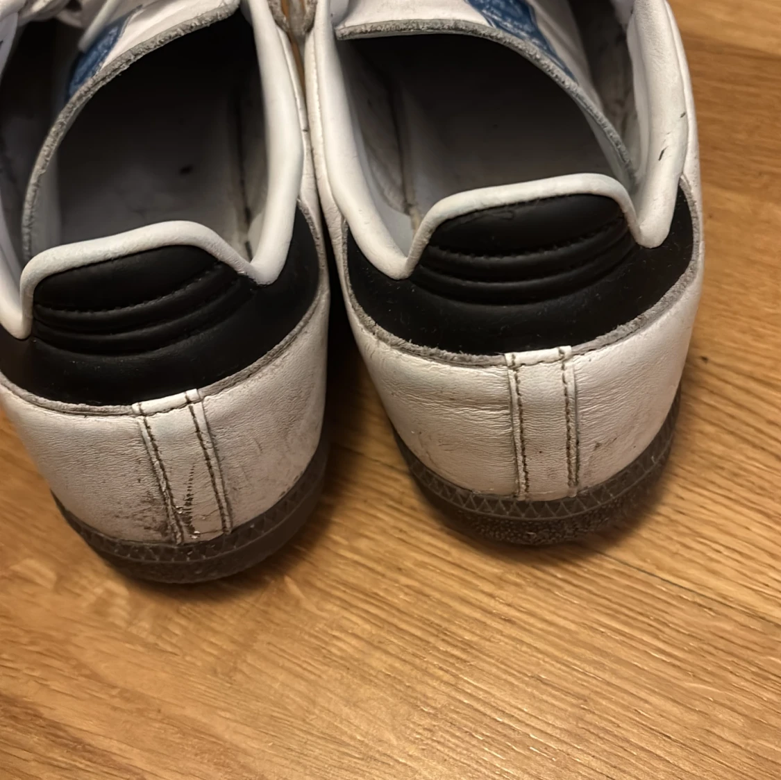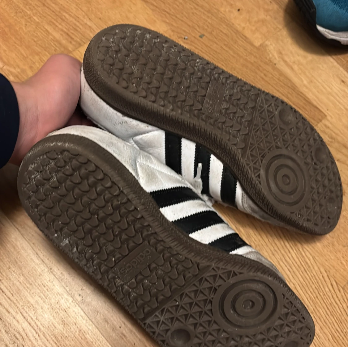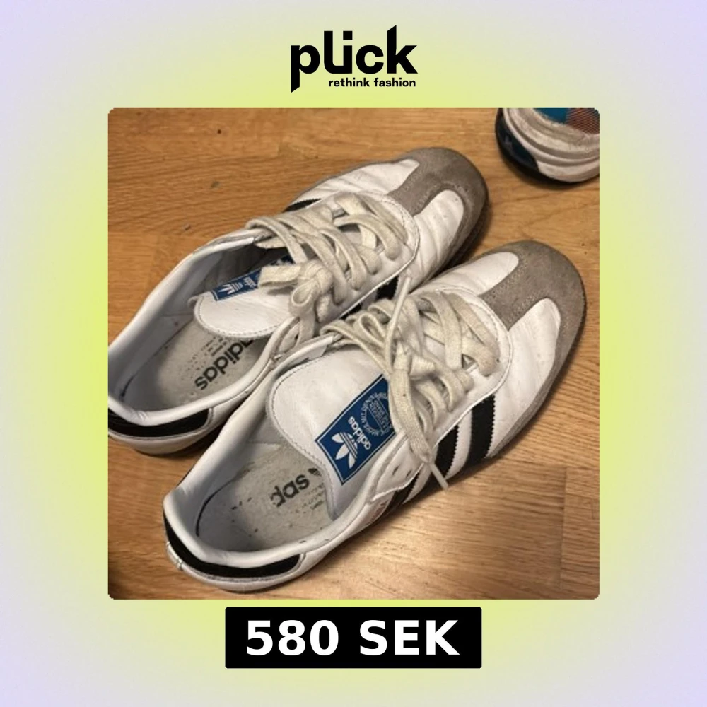 Klassiska Adidas Samba sneakers i vitt och svart med snörning. Skorna har en stilren design med de ikoniska tre ränderna på sidan och en brun sula. Perfekta för en sportig look. Skriv innan ni köper