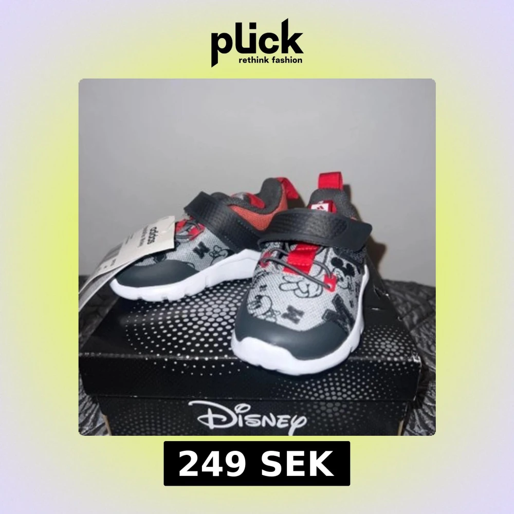 Snygga och lekfulla barnskor från Adidas med Disney-motiv. Skorna har en grå bas med svarta och röda detaljer samt ett mönster av Disney-figurer. De har en praktisk kardborreknäppning och en bekväm vit sula. Helt nya. Storlek 20.