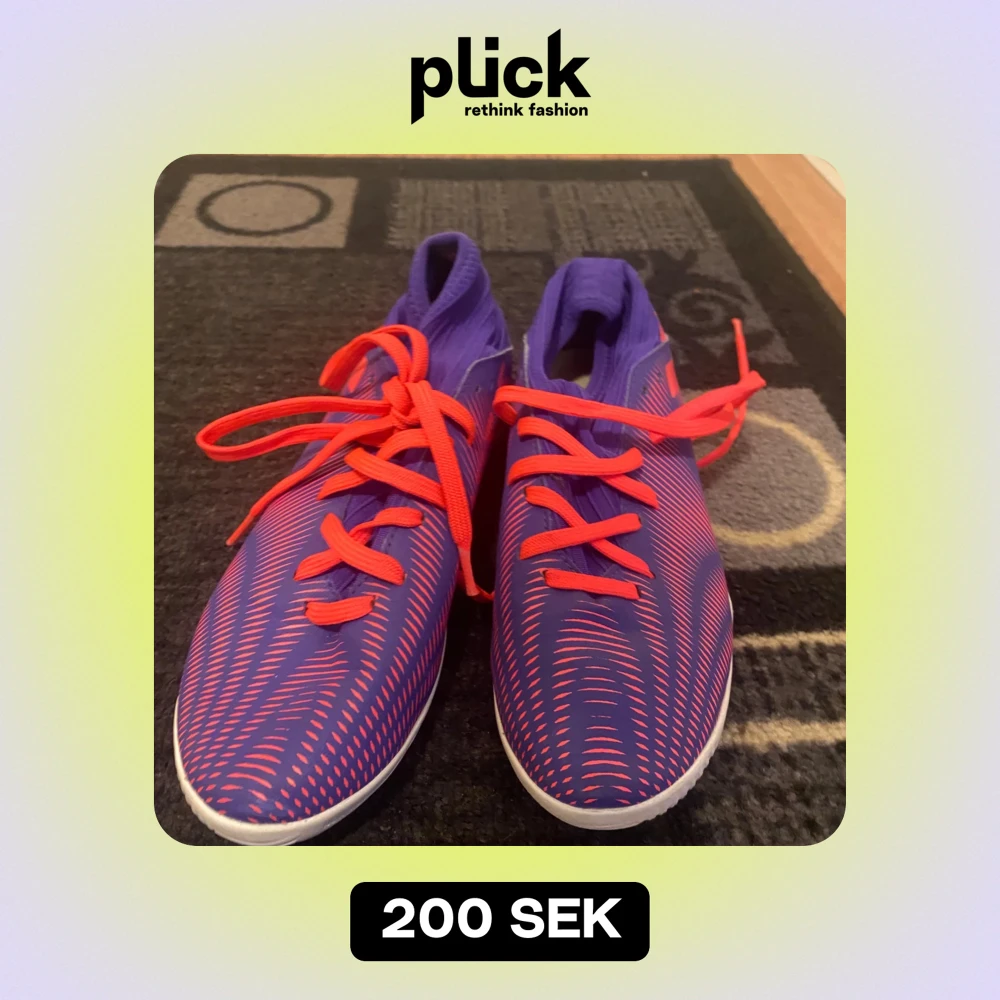 Säljer ett par coola fotbollsskor i lila med röda detaljer och snörning. Skorna har en modern design med ett mönster som ger en extra touch. Perfekta för både träning och match!