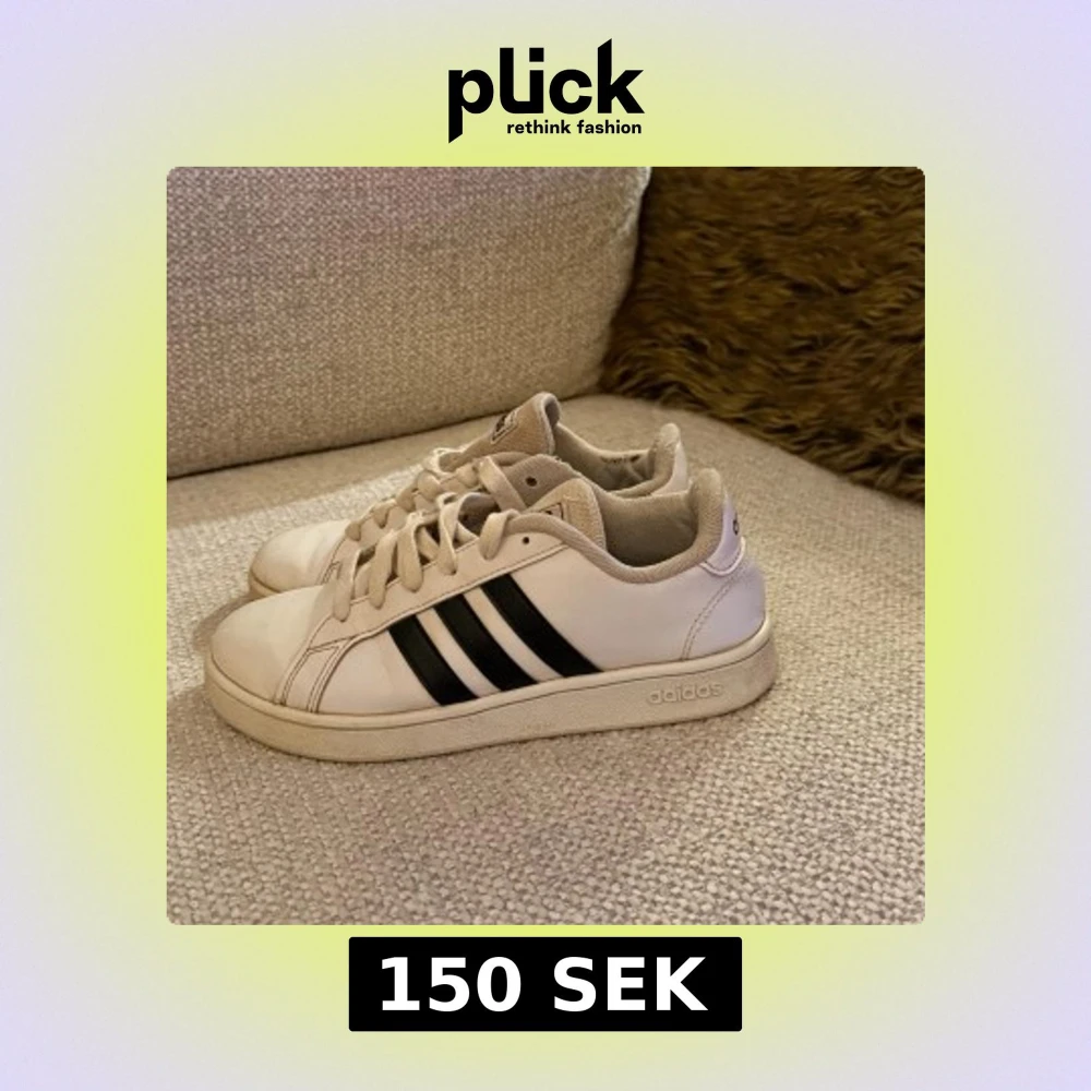 Snygga vita sneakers från Adidas med klassiska svarta ränder på sidorna och logga baktill. Skorna har rund tå, platt sula och snörning framtill. Tillverkade i skinn med mjukt textilfoder för extra komfort. Perfekta för dig som gillar stilrena och sportiga skor.