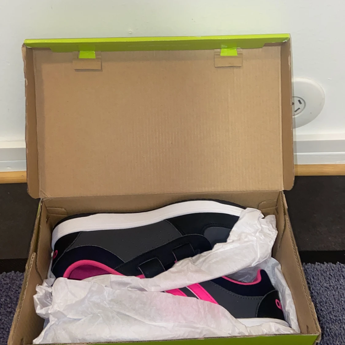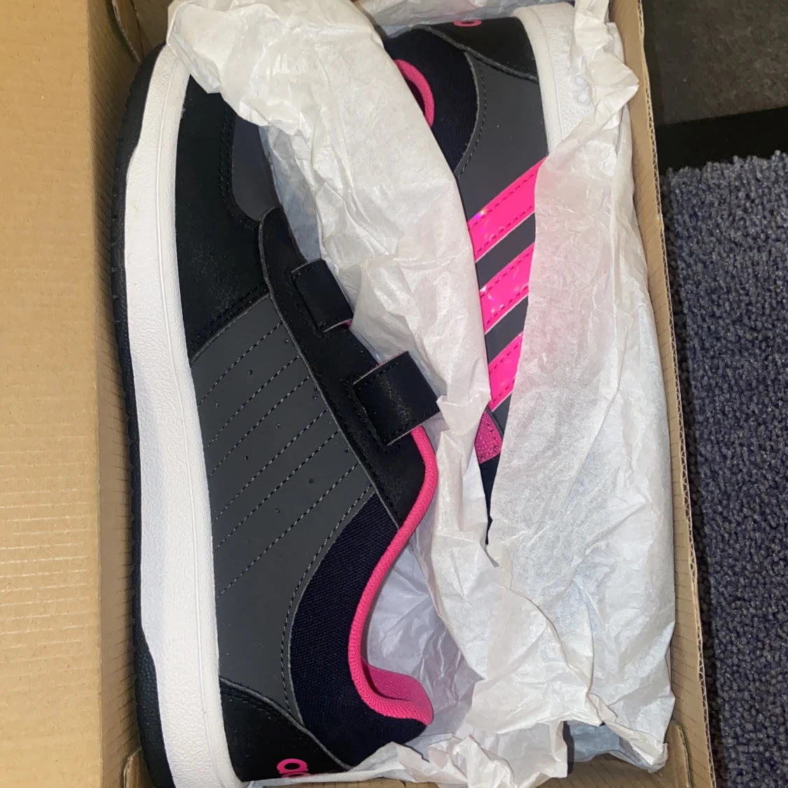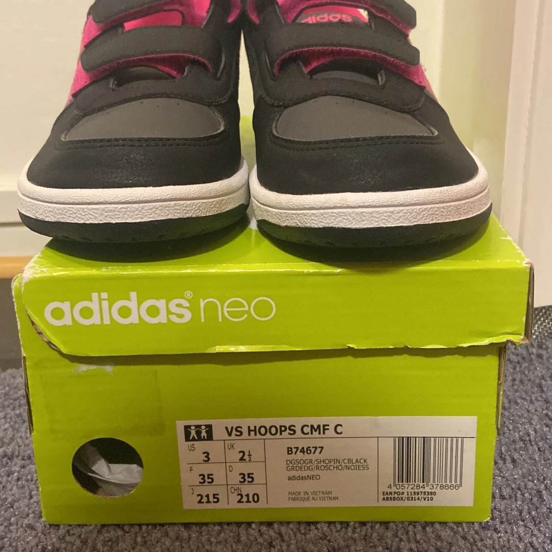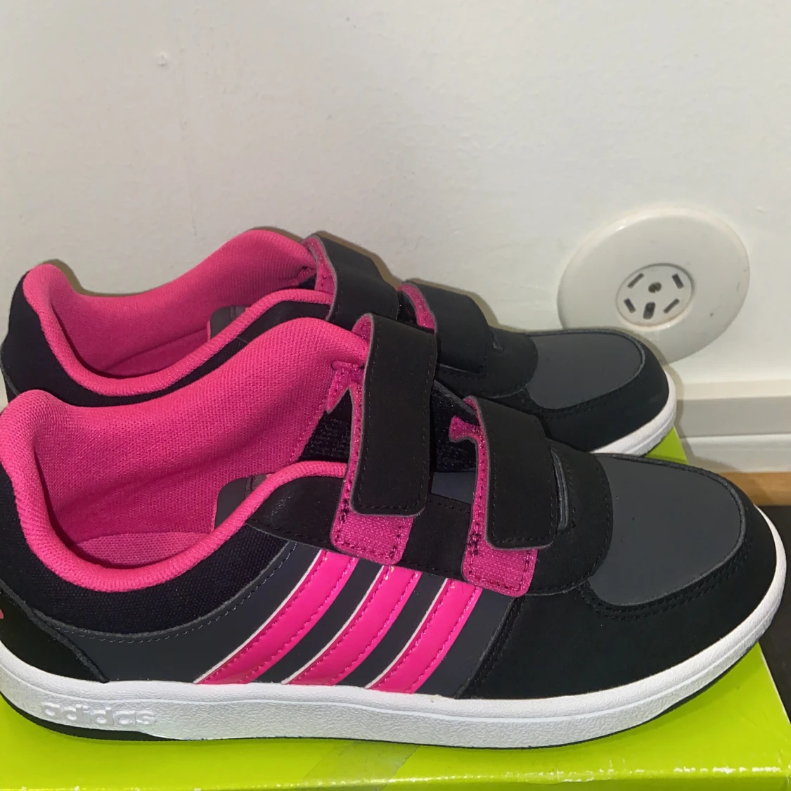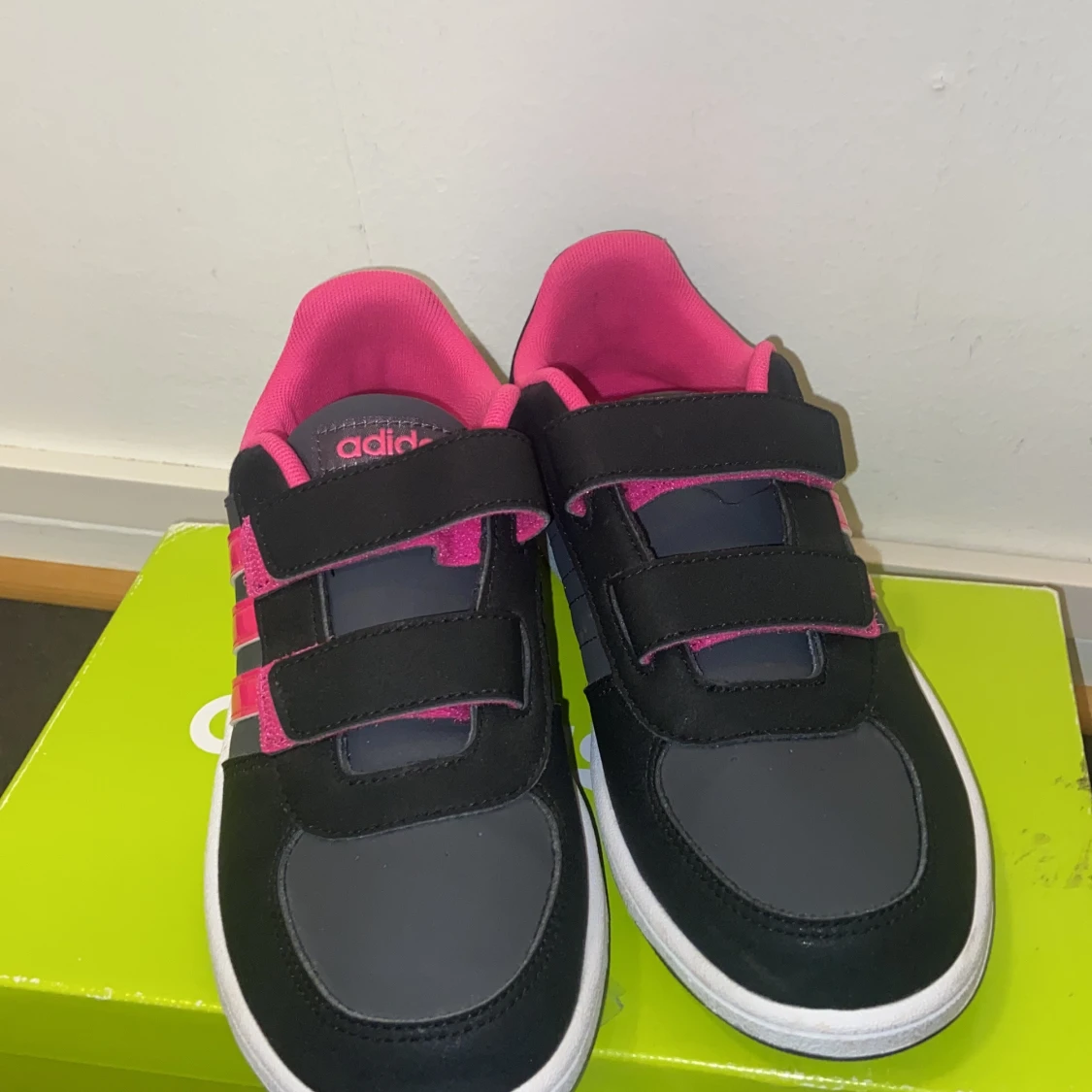 Snygga svarta sneakers med rosa detaljer från Adidas. Skorna har kardborreband för enkel på- och avtagning. De har en vit sula och tre rosa ränder på sidan. ALDRIG ANVÄNDADE