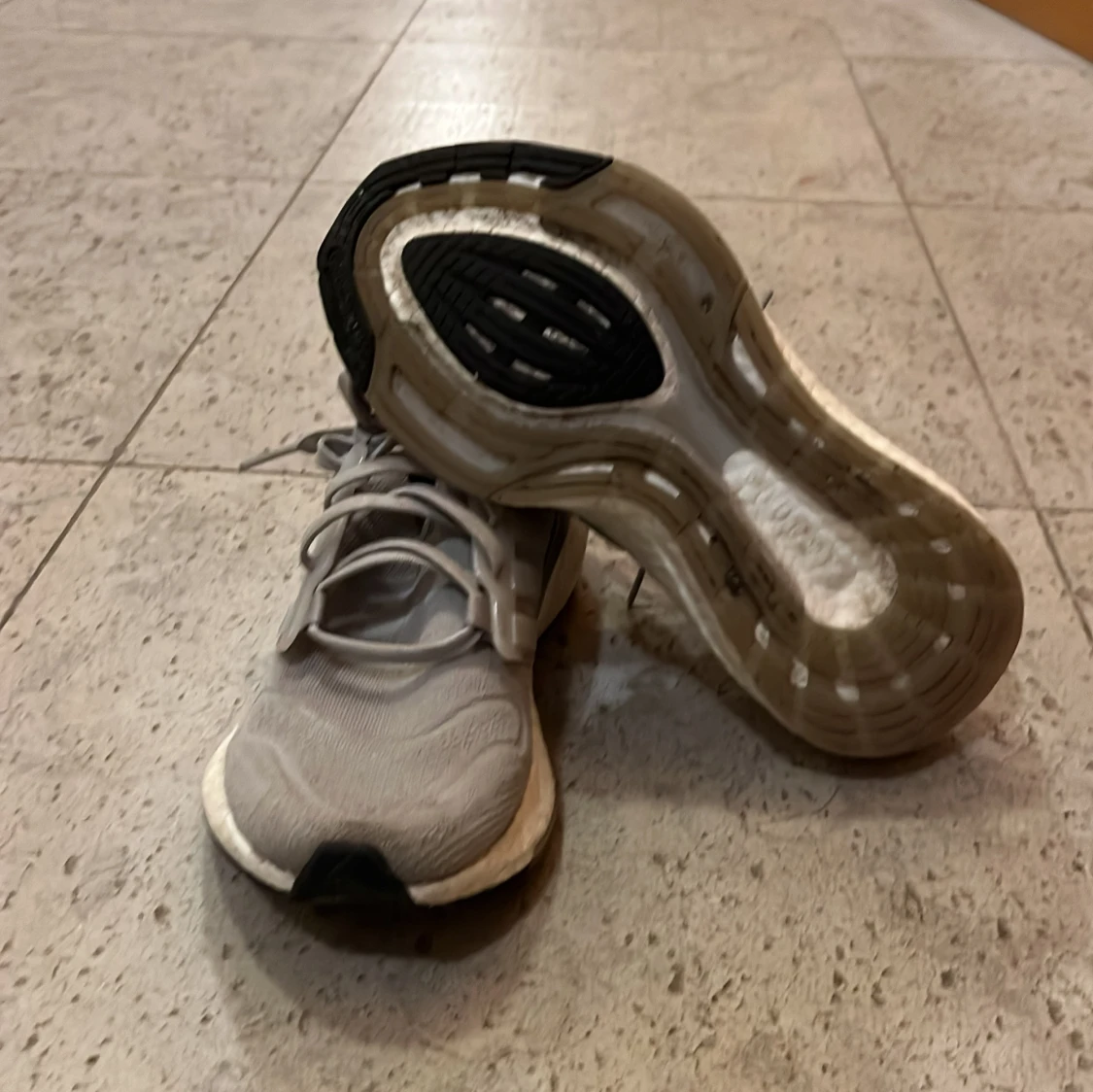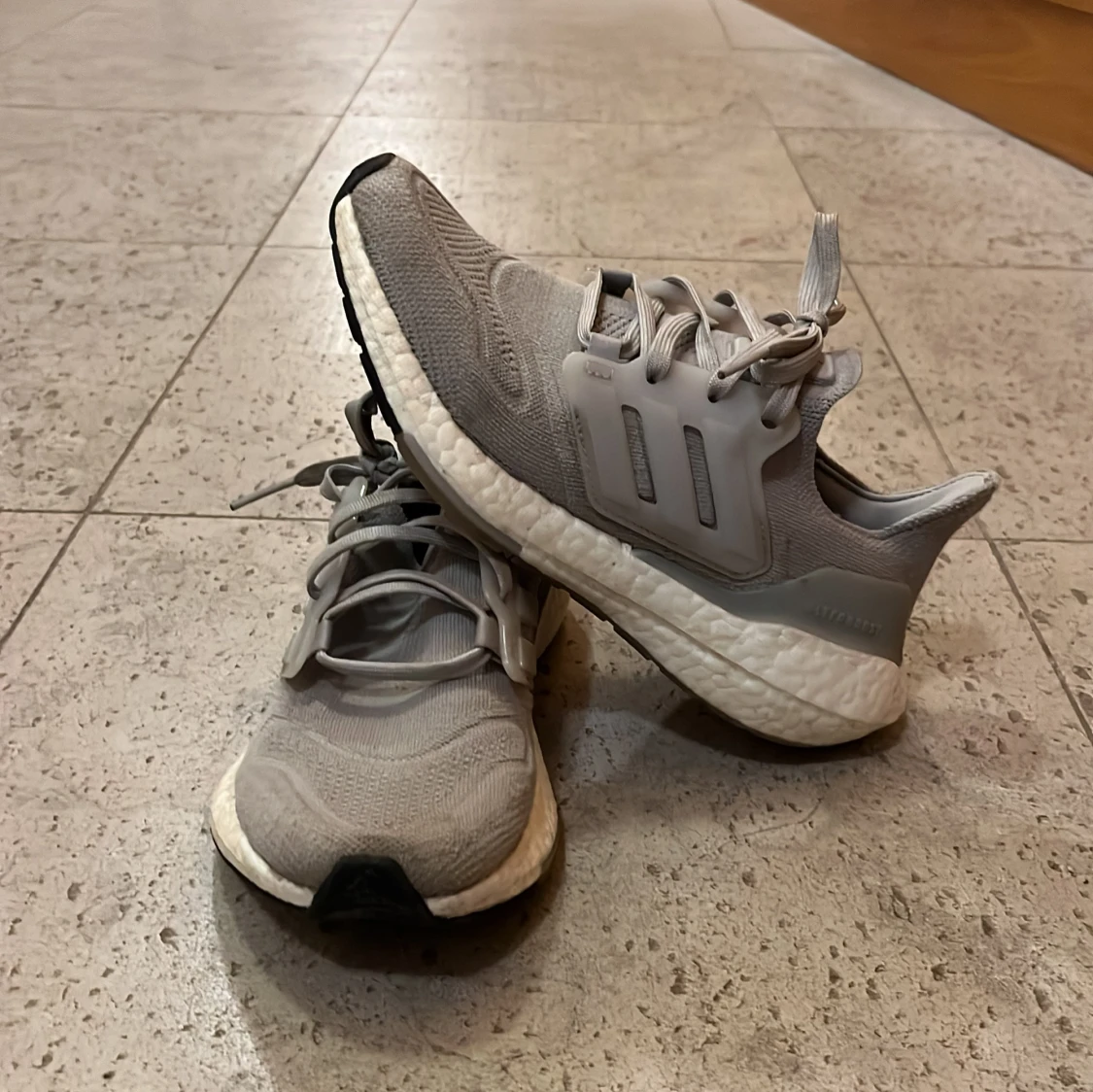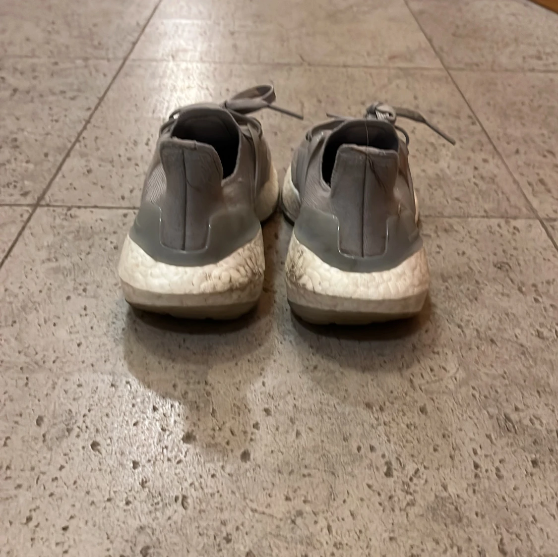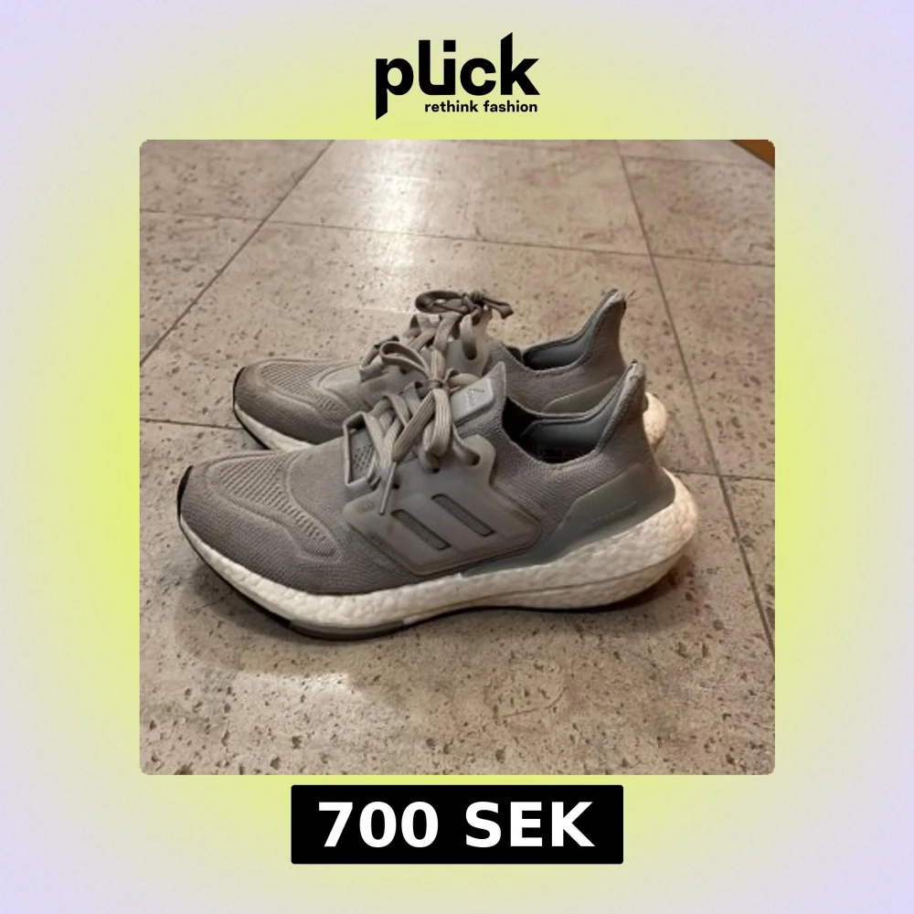 Säljer ett par grå Adidas Ultraboost sneakers med stickad ovandel och klassiska tre ränder på sidan. Skorna har en vit, dämpad sula och snörning framtill. Perfekta för dig som gillar stilrena och bekväma sneakers med sportig känsla.