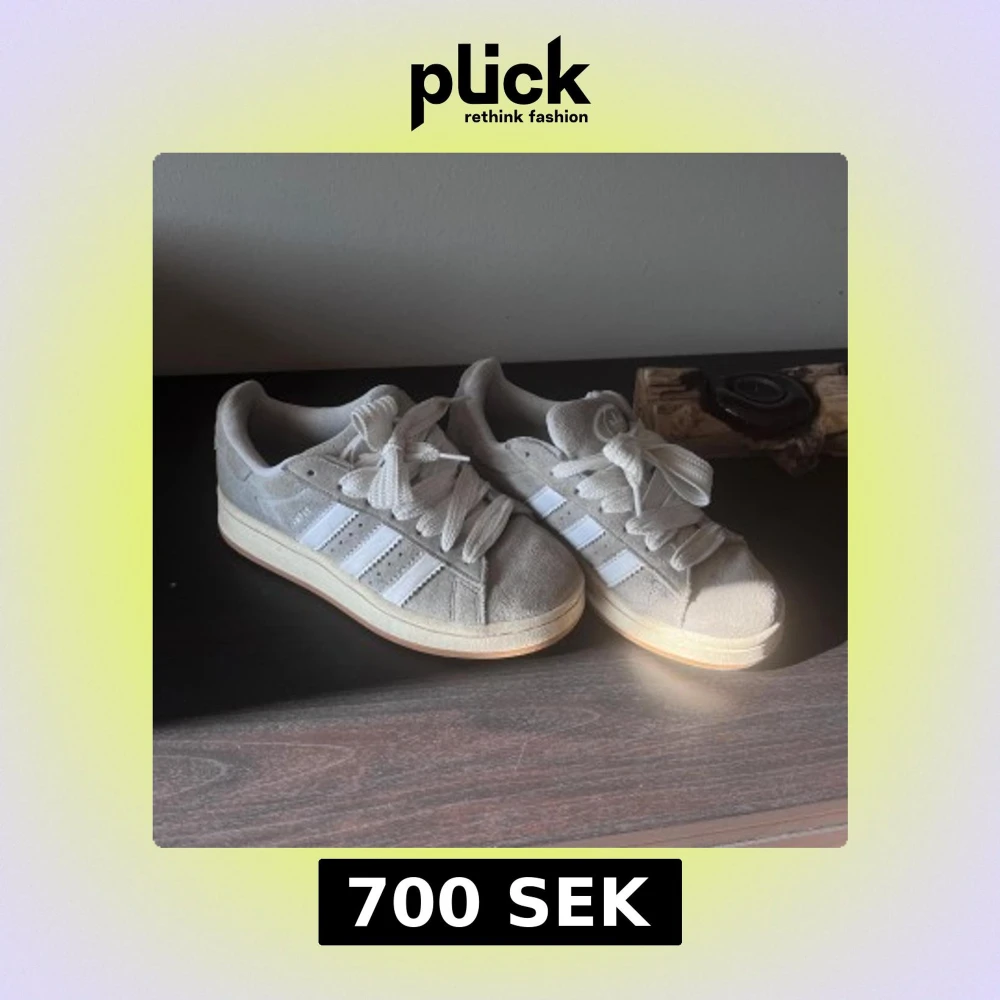 Säljer ett par grå Adidas Campus sneakers med vita ränder och vit sula. Skorna har breda vita skosnören och är i mocka med klassisk Adidas-logga på plösen. Perfekta för dig som gillar en stilren och tidlös look. Använda några få gånger på crossbanan därav lite dammigt på mockan. Original skolådan finns med och skickas med!