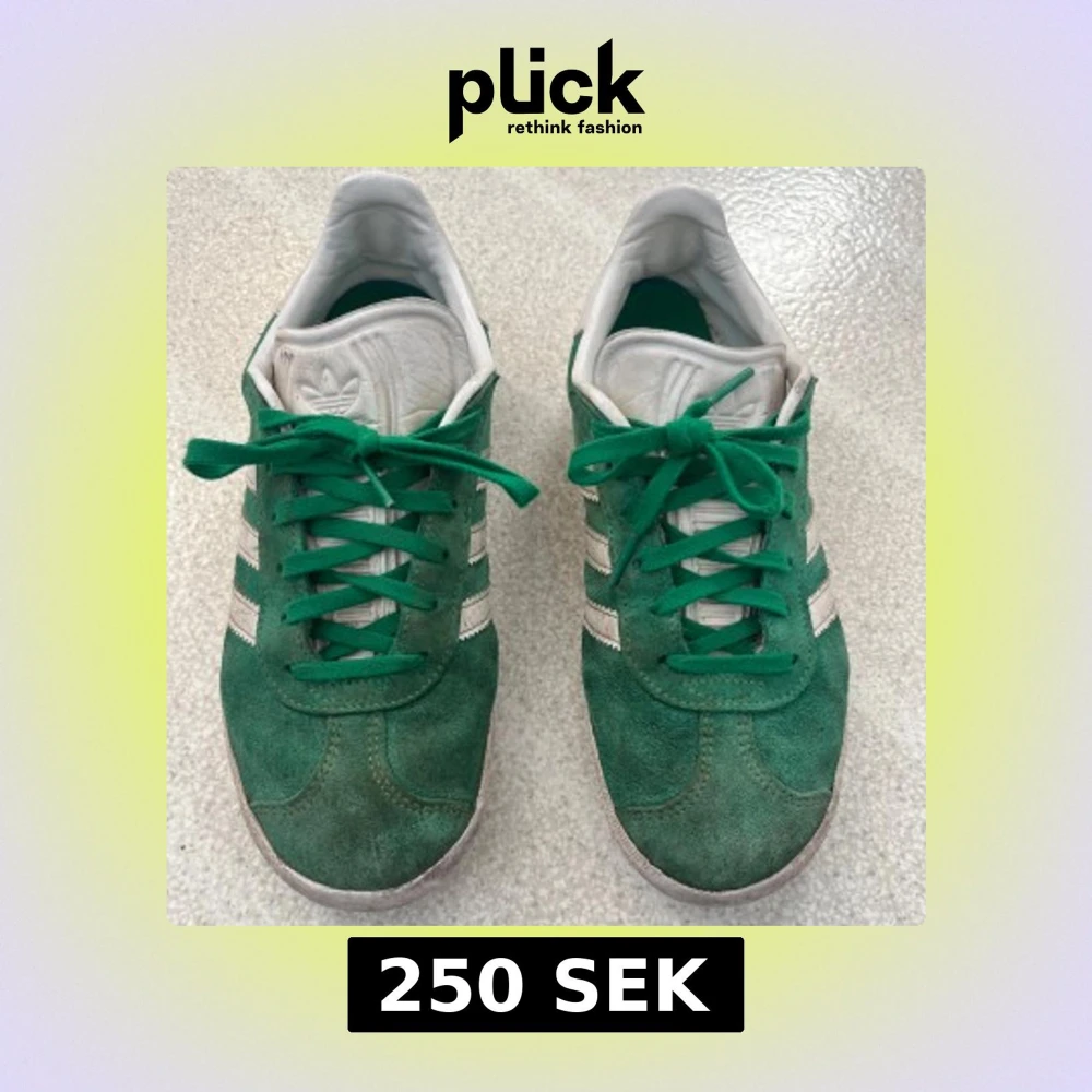 Snygga gröna Adidas Gazelle. Är lite sönder under skon på båda men det märks inte. Sulan på båda skona kan behövas bytas lite söder uppe på sulan. Annars är det en jättefin sko.