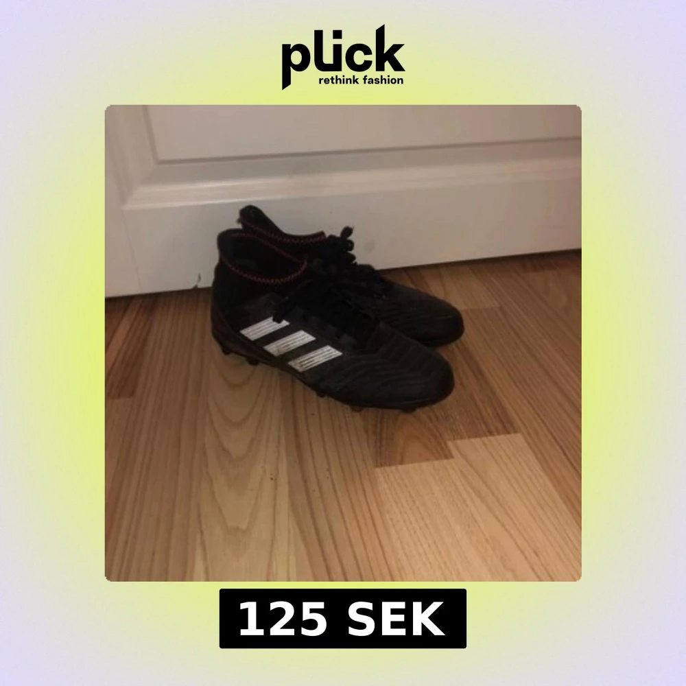 Säljer ett par svarta fotbollsskor från Adidas med vita ränder och snörning. Skorna har en högre ankel och är designade för bra grepp på planen. Perfekta för fotbollsträning och matcher.