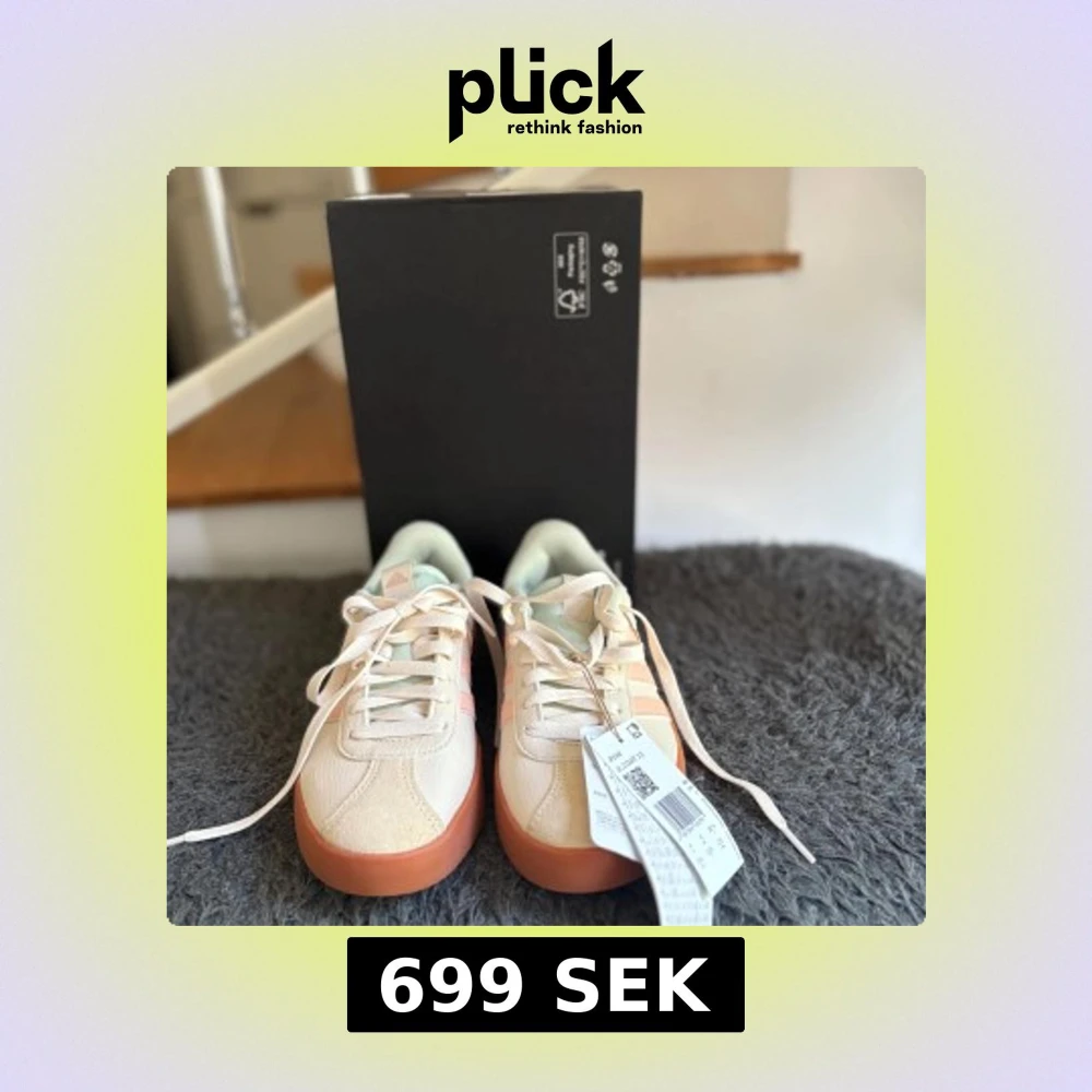 Fräscha Adidas VL Court 3.0 sneakers i ljusbeige och ljusrosa med klassiska tre ränder på sidan. Skorna har en platt gummibrun sula och snörning framtill. Ovandelen är i syntet och mocka, med mjuk mintgrön insida för extra komfort. Perfekt för dig som gillar clean och sportig stil. De är sprillans nya, helt oanvända och väldigt fint skick. Boxen och kvitto finns vid behov av att se de. Köpte för 780kr mitt pris 699kr. Lägg bud som kan diskuteras. Det är bara att höra av sig vid minsta fundering.