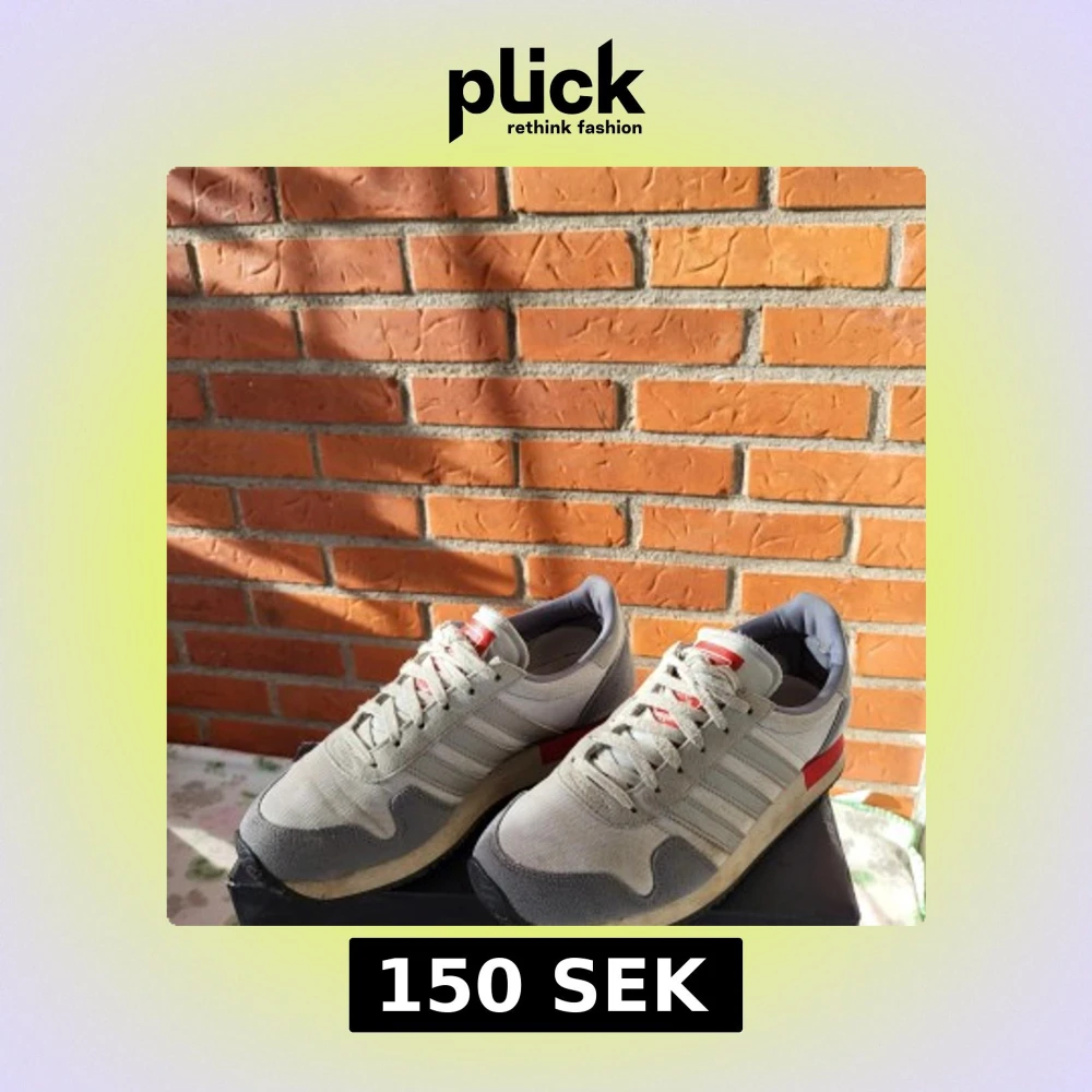 Säljer ett par klassiska Adidas sneakers med retrovibbar i grått, vitt och röda detaljer. Skorna har de ikoniska tre ränderna på sidan, snörning och platt sula. Ovandelen är i textil och mocka, med Adidas-logga på häl och plös. Perfekt för dig som gillar old school-stil.