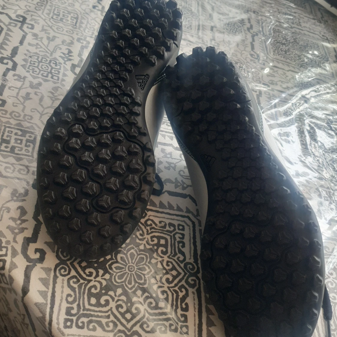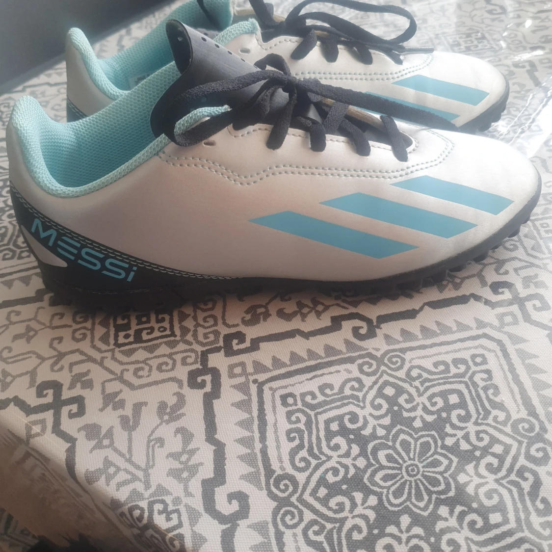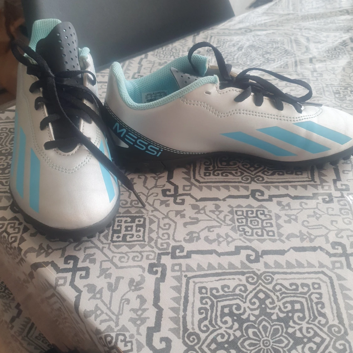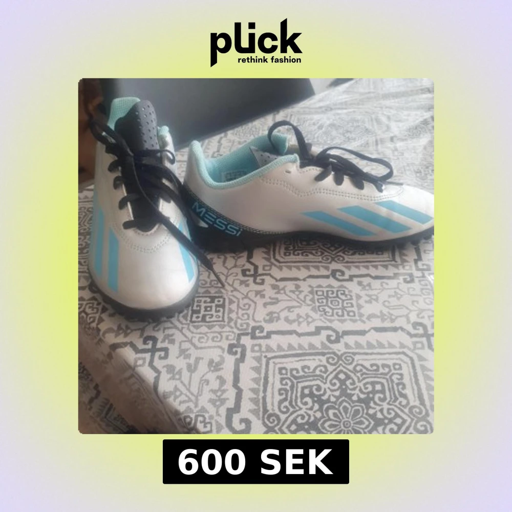 Säljer ett par nya i silver och ljusblått med svarta detaljer. Skorna har snörning, platt sula med gummidobbar och klassiska Adidas-ränder på sidan. Messi-logga på hälen och insidan. Perfekta för dig som älskar fotboll och vill sticka ut på planen. Aldrig använda.