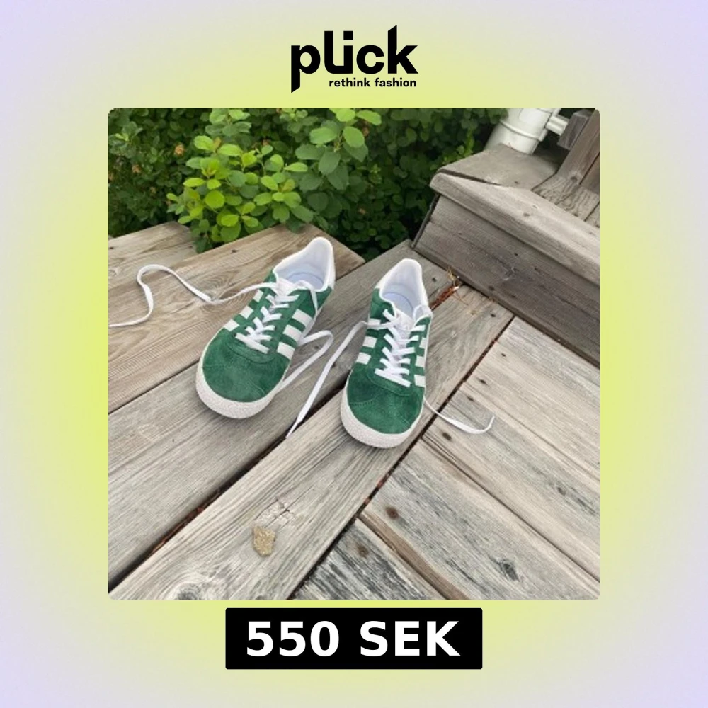 Säljer ett par gröna Adidas Gazelle sneakers i mocka med vita detaljer och klassiska tre ränder på sidorna. Skorna har vit sula, snörning och guldtext på sidan. Perfekta för dig som gillar retrostil och vill sticka ut med färg.