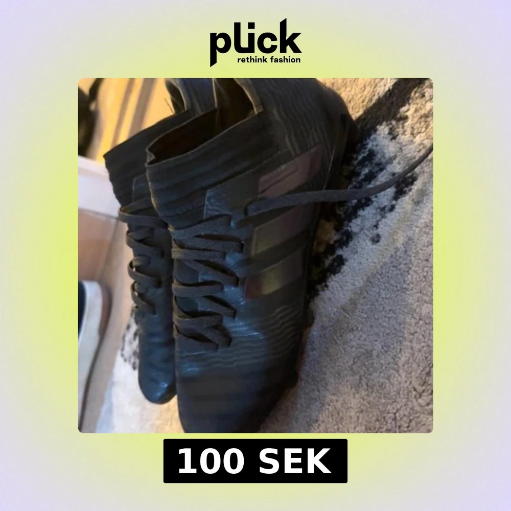 Säljer ett par svarta Adidas fotbollsskor med klassiska tre ränder på sidan. Skorna har snörning och är tillverkade i syntetmaterial med en modern, sportig design. Perfekta för dig som vill ha stilrena och funktionella skor på planen.