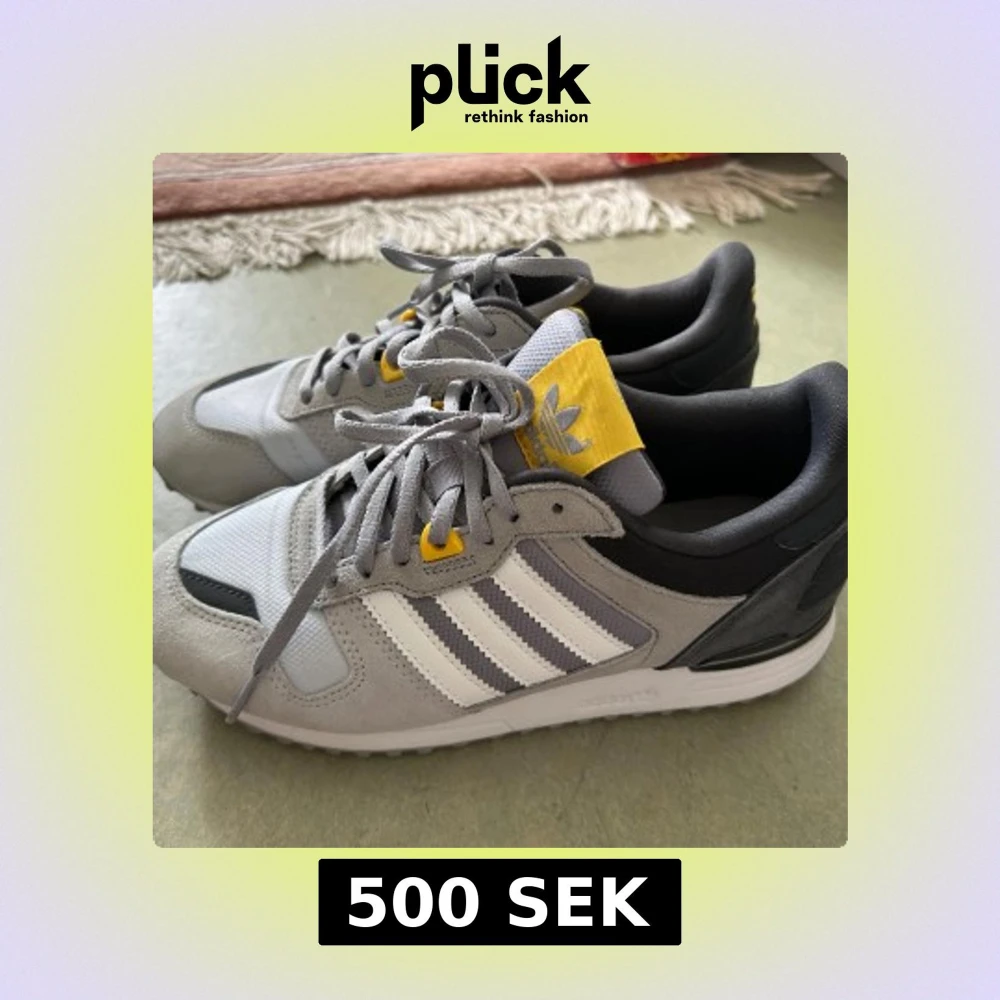 Nya Snygga Adidas sneakers i grått med vita ränder och gula detaljer på plösen och snörhålen. Ovandelen är i mocka och textil, med svart häl och vit sula. Klassisk retrostil som passar perfekt till streetwear och vardagsoutfits.
