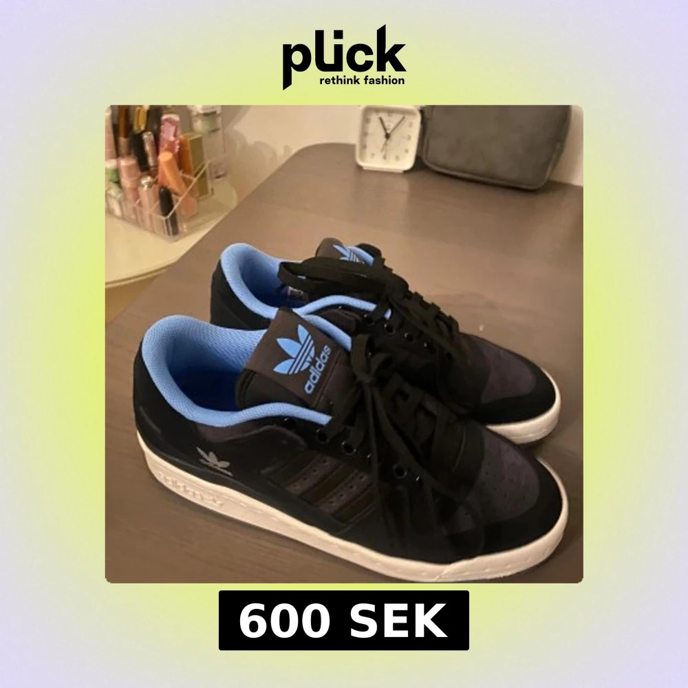 Säljer ett par Adidas Forum 84 Low ADV sneakers i svart och blått med vit sula och genomskinlig yttersula. Skorna har snörning, rund tå och klassisk Adidas-logga på plösen. Insidan är klädd i ljusblått tyg för extra kontrast. Perfekt för dig som gillar retrostil och streetwear.