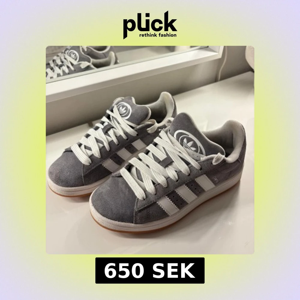 Säljer ett par klassiska Adidas Gazelle sneakers i grå mocka med vita ränder och vit sula. Skorna har rund tå, platt sula och breda vita skosnören. Perfekta för en stilren vardagslook.