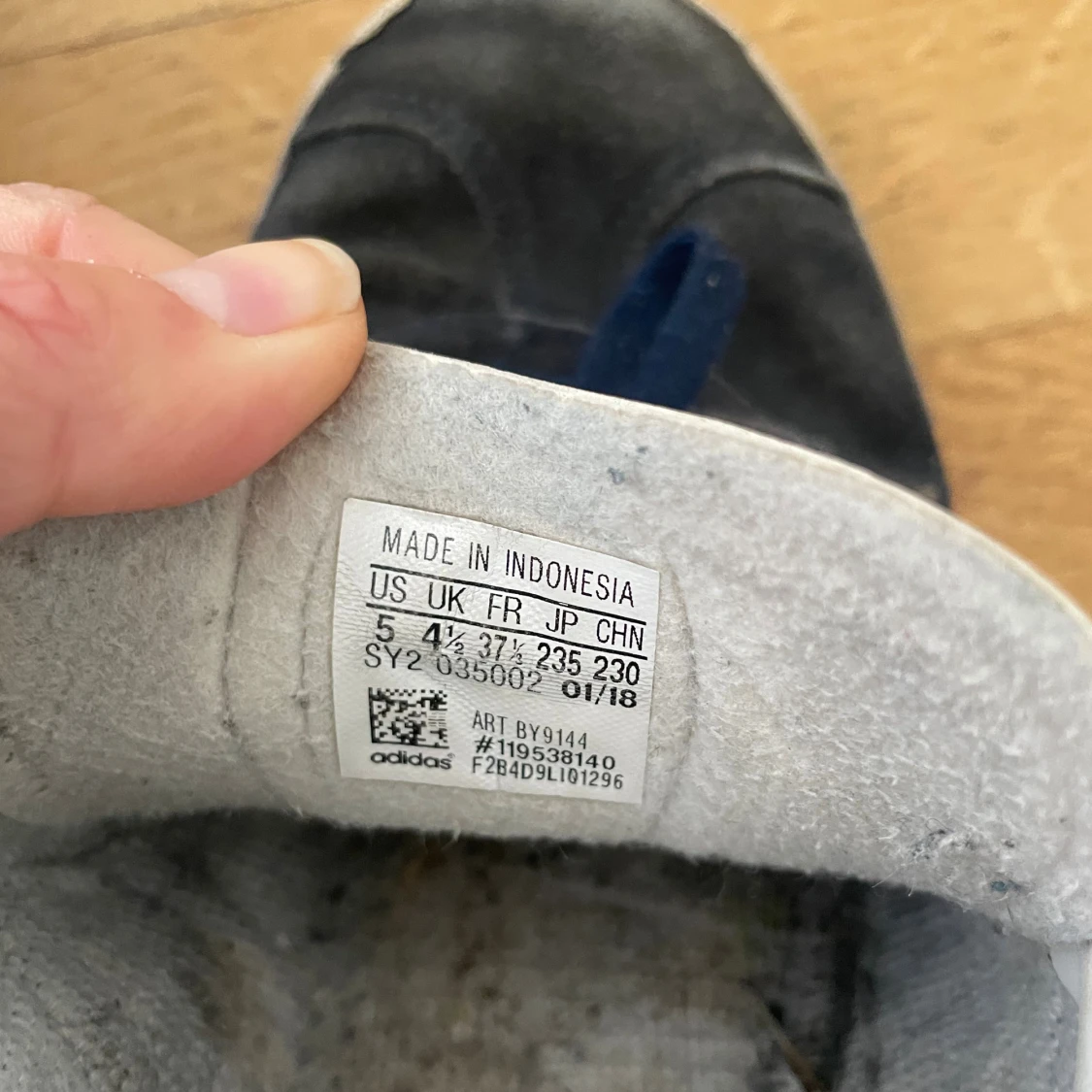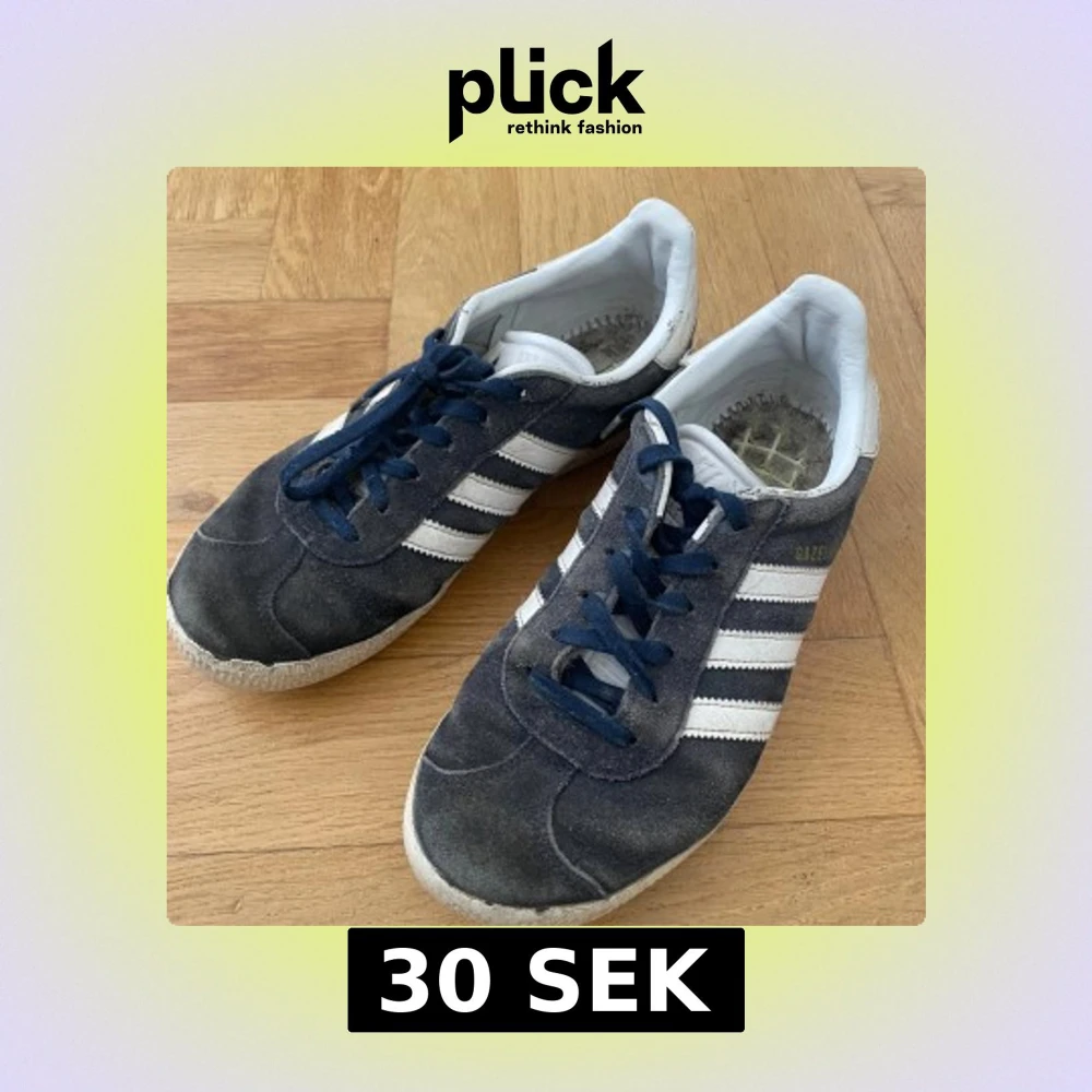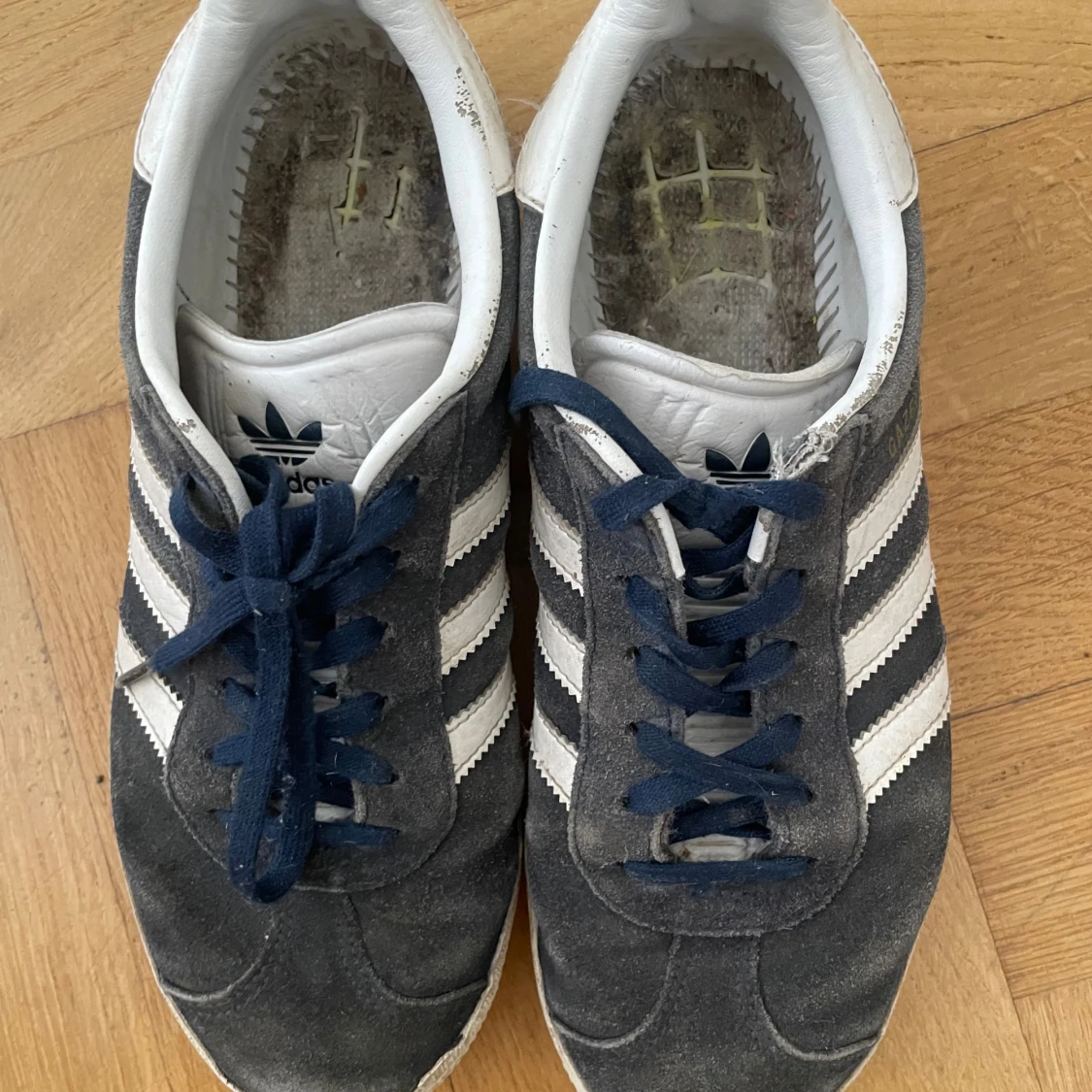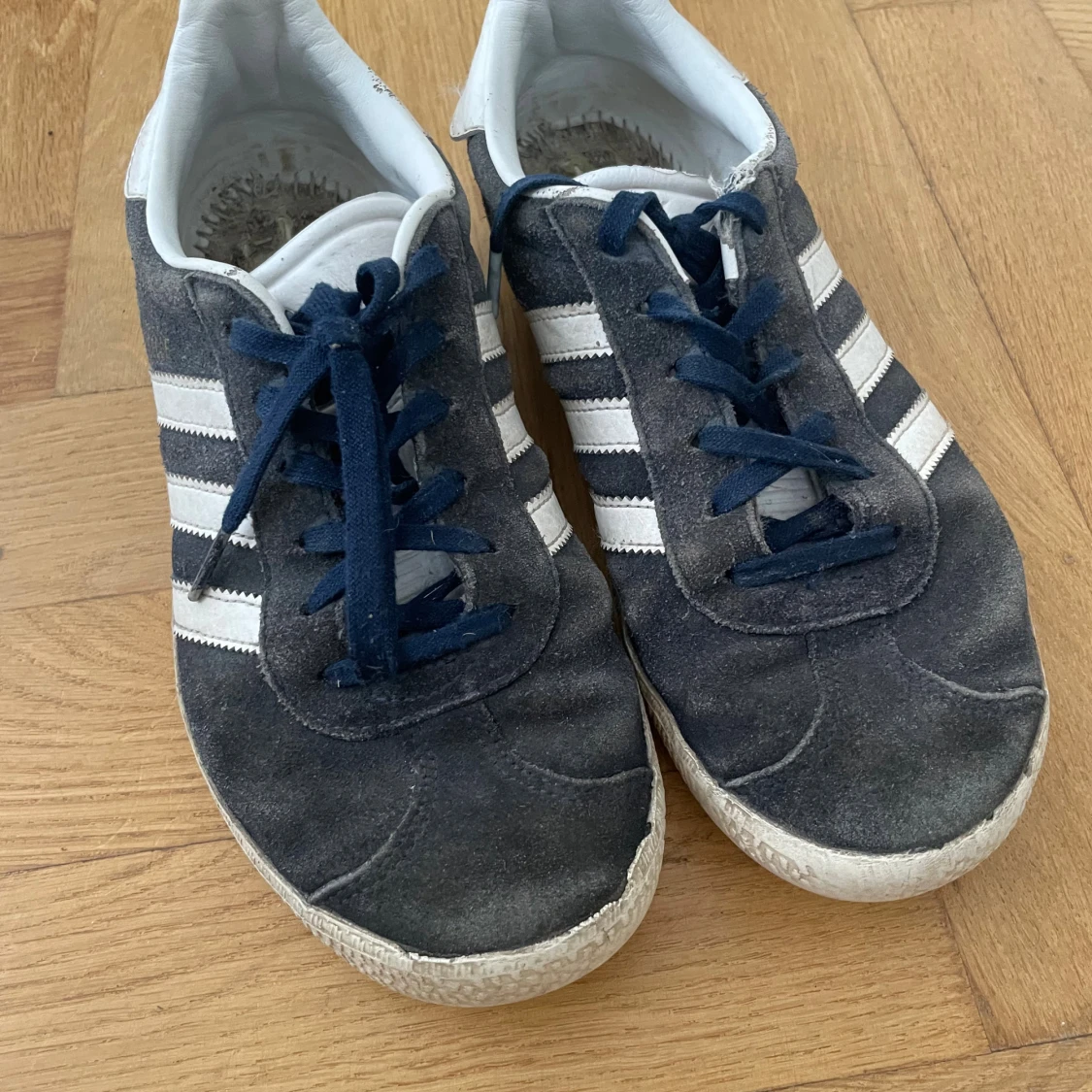 Säljer ett par klassiska Adidas Gazelle sneakers i mörkblå mocka med vita detaljer och de ikoniska tre ränderna på sidorna. Skorna har blå snörning, vit plös och vit insida. Perfekta för dig som gillar retrostil och streetwear. Saknar innersula