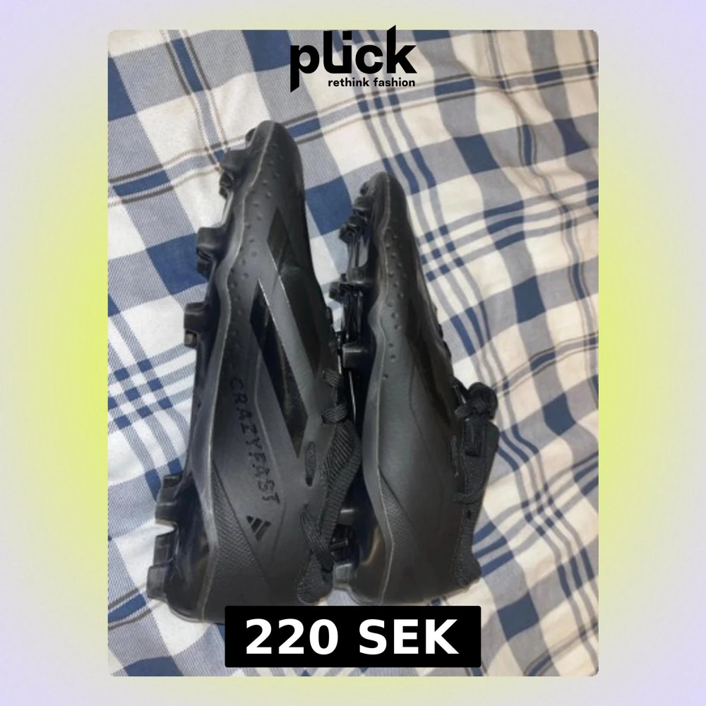 Säljer ett par svarta Adidas Crazyfast fotbollsskor med snygga svarta detaljer och mönstrad ovandel. Skorna har snörning och en platt sula med dobbar för gräsplan. Materialet är syntet och designen är modern med rund tå. Perfekt för dig som vill ha stil på planen.
