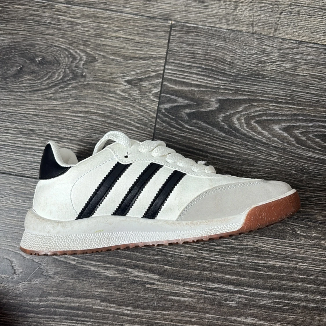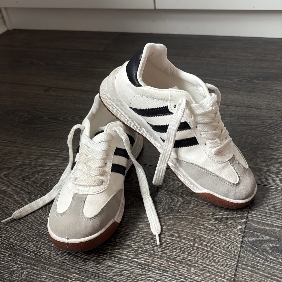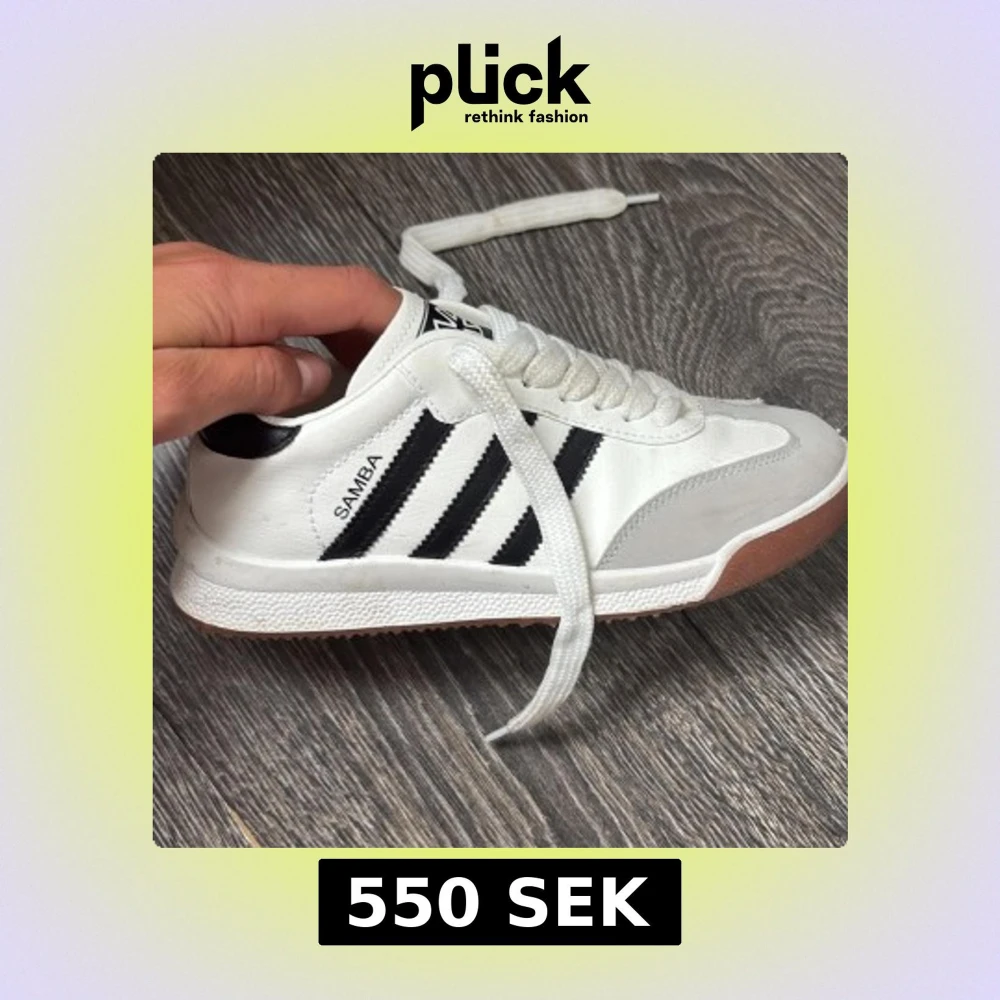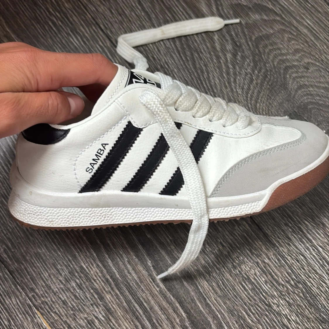 Adidas Samba sneakers i vitt skinn med svarta ränder och detaljer, klassisk brun gummisula och snörning. Modellen har rund tå och grå mockadetaljer framtill. Perfekta för dig som gillar retrostil och streetwear.