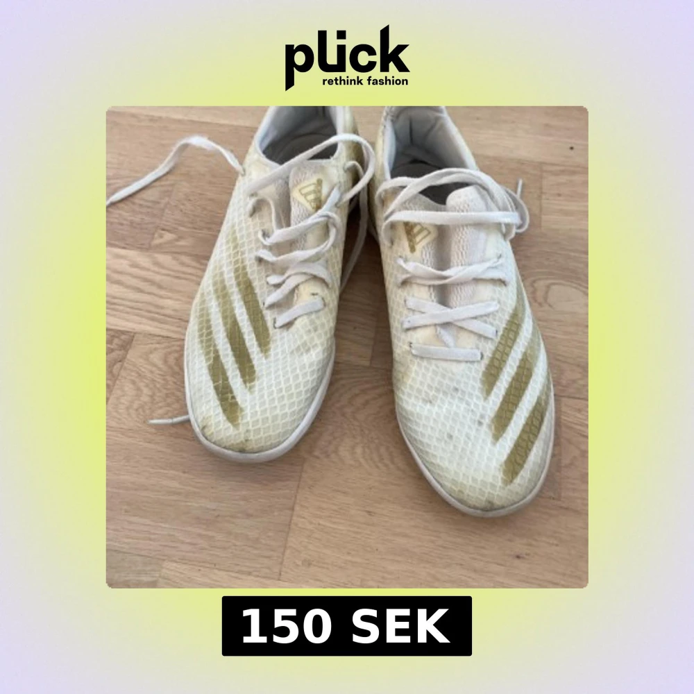 Säljer ett par vita Adidas fotbollsskor med guldiga detaljer och snörning. Skorna har ett mönstrat mesh-överdrag och platt sula som ger bra grepp på planen. Perfekta för dig som vill sticka ut med stilrena och sportiga skor.