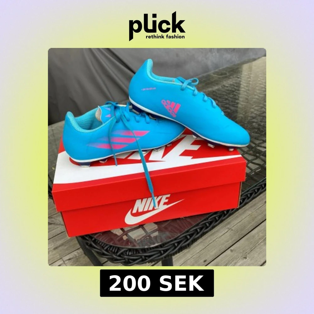 Snygga blå fotbollsskor från Adidas med rosa detaljer och snörning. Skorna har en robust sula med dobbar för bra grepp på planen. Perfekta för fotbollsträning och matcher.