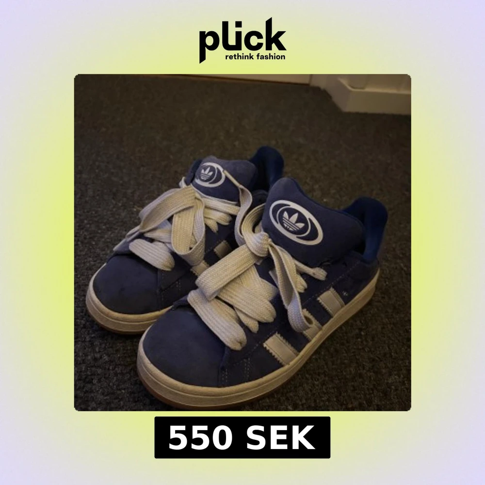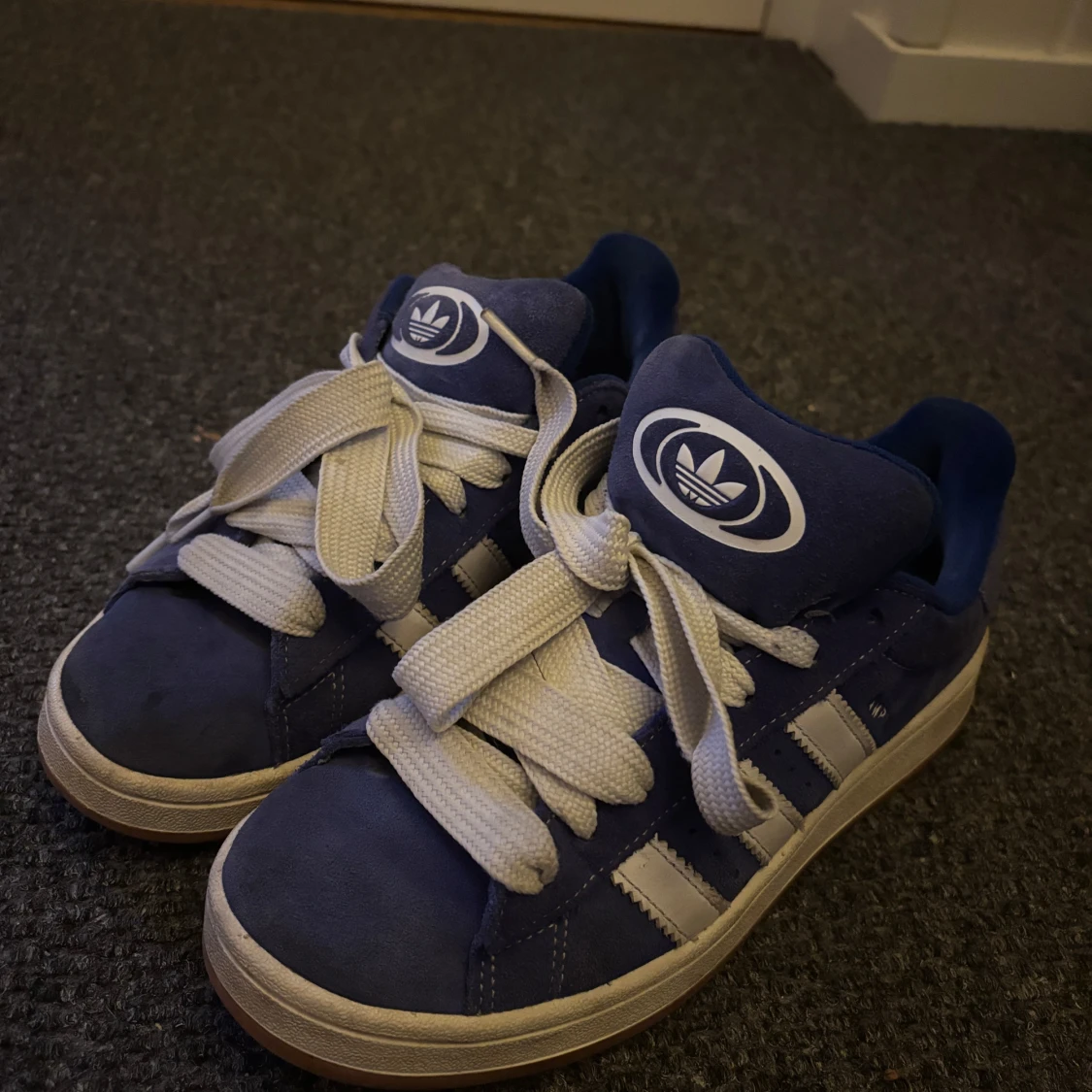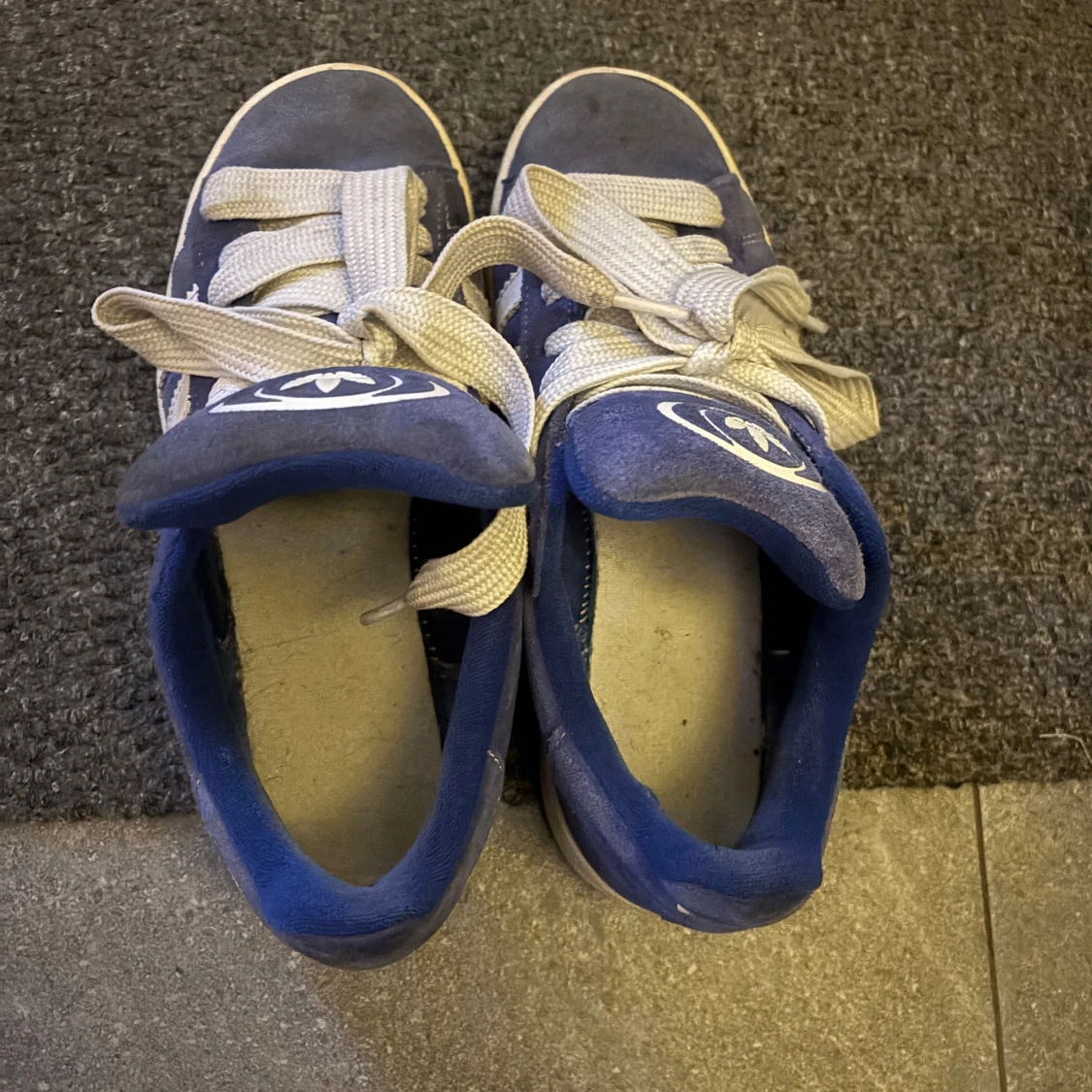 As fina blåa adidascampus i storlek 38 2/3, använt fåtal gånger och ser ut som nya. Tjocka vita skosnören. Kom tyvärr inte till användning mer