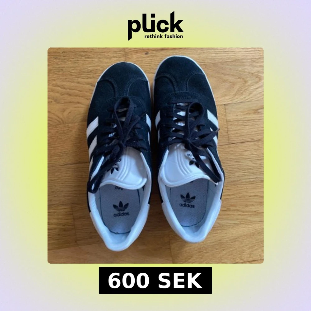 Säljer ett par klassiska Adidas Gazelle sneakers i svart mocka med vita detaljer och de ikoniska tre ränderna på sidan. Skorna har snörning och vit sula samt Adidas-logga på häl och plös. Perfekta för en stilren vardagslook. Använda 2 gånger.
