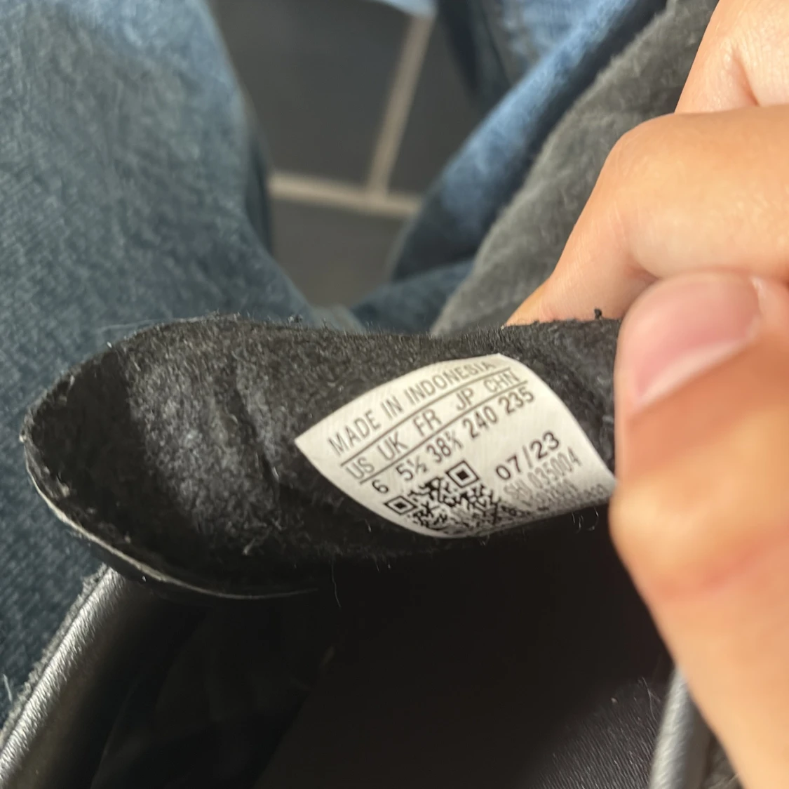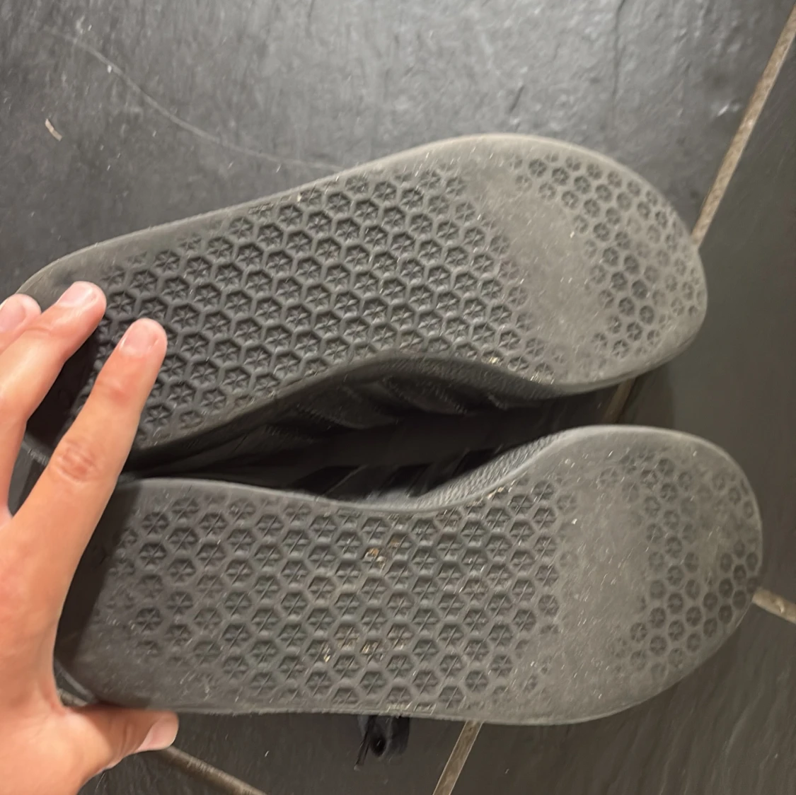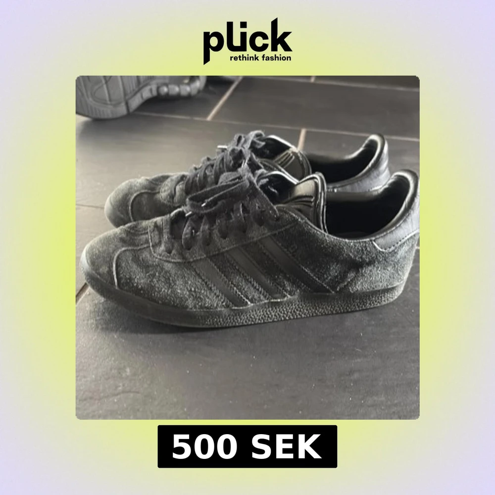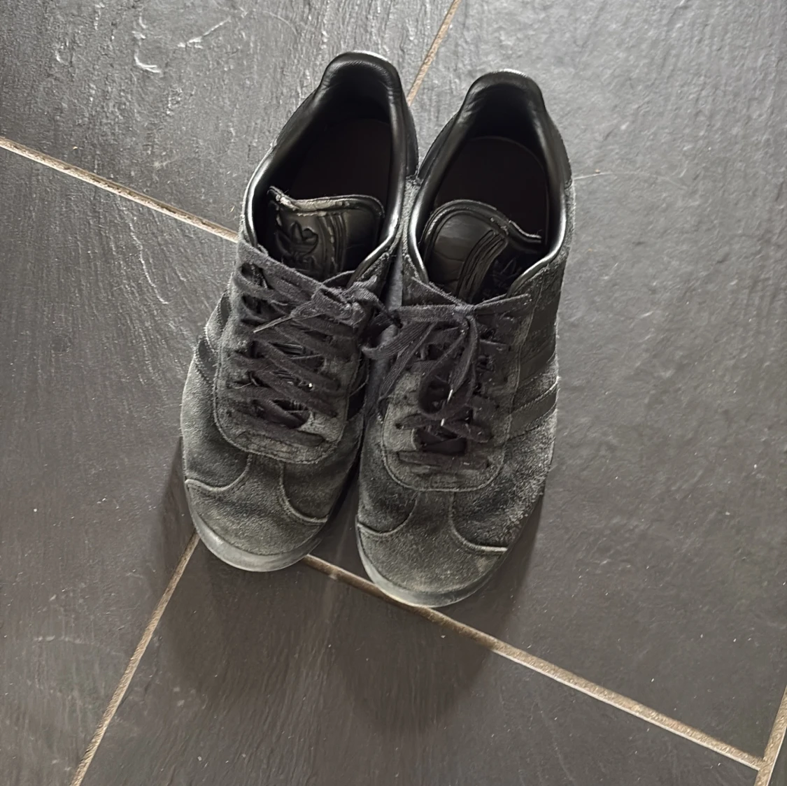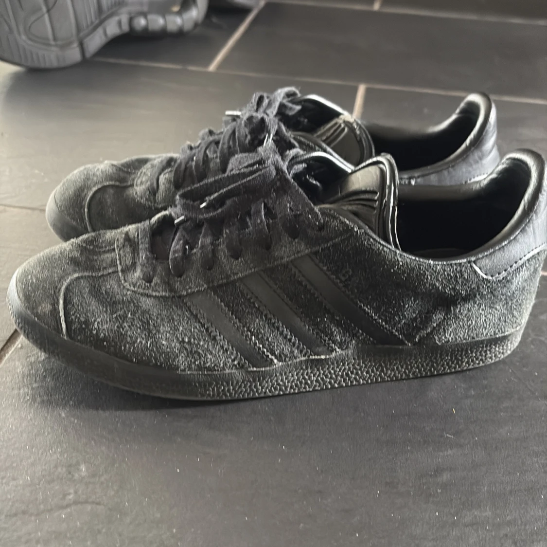 Säljer ett par svarta adidas Gazelle med klassiska tre ränder på sidan. Skorna är i mocka med detaljer i skinn och har snörning. Snygg och tidlös modell med platt sula och rund tå, perfekt för dig som gillar streetstyle. Passar dig som bär storlek 38/39