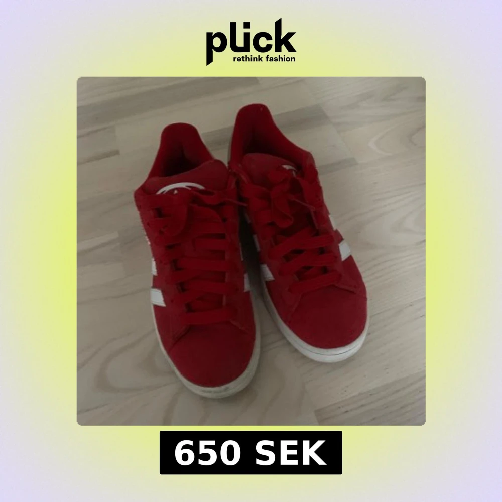Snygga röda Adidas Campus sneakers med klassiska vita ränder på sidorna och vit logga på hälen. Ovandel i mocka, platt sula och snörning framtill. Perfekta för dig som vill sticka ut med färg och ikonisk streetstyle. Fint skick, lite smutsiga bak vid hälen. Använda 3 gånger. Köpta för 1300