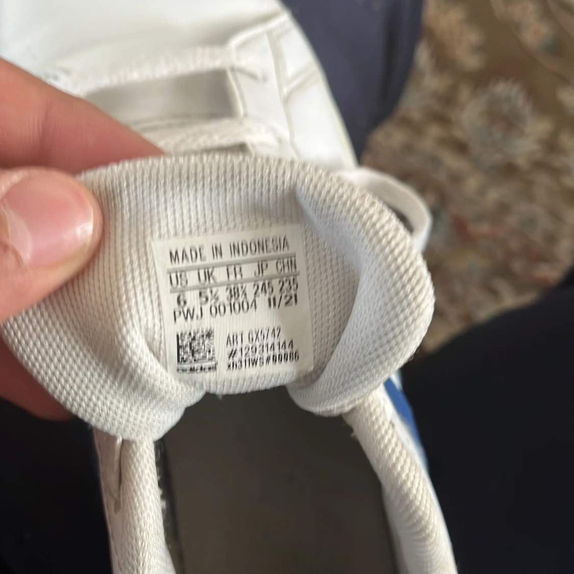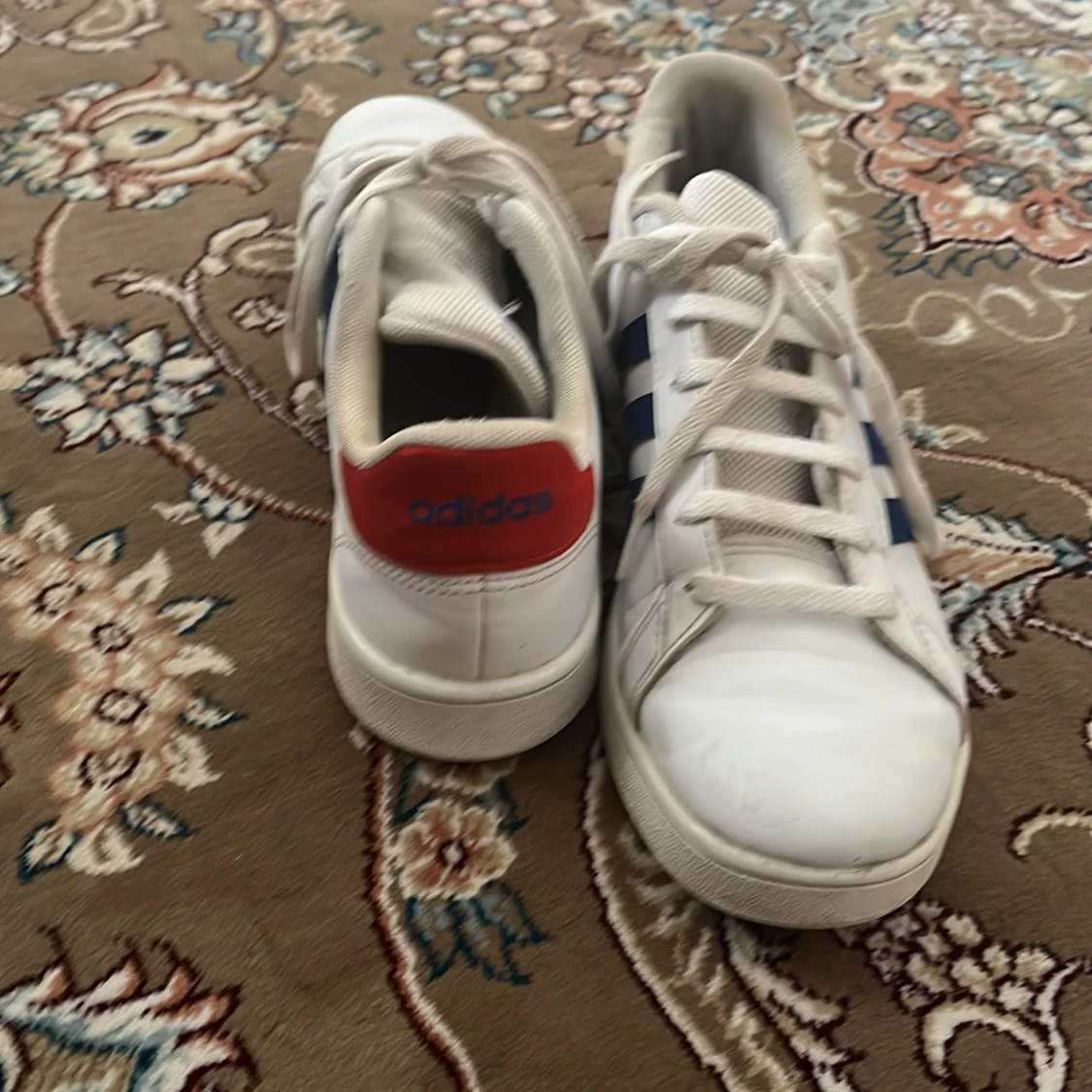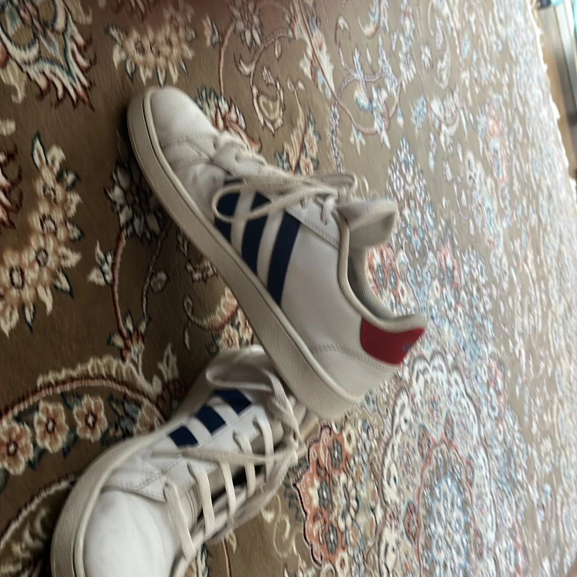 Snygga vita adidas sneakers med klassiska blå ränder på sidorna och röd detalj på hälen. Skorna har snörning och platt sula, samt adidas-logga på plös och häl. Perfekta för en sportig och stilren look.Priset kan deskutera.