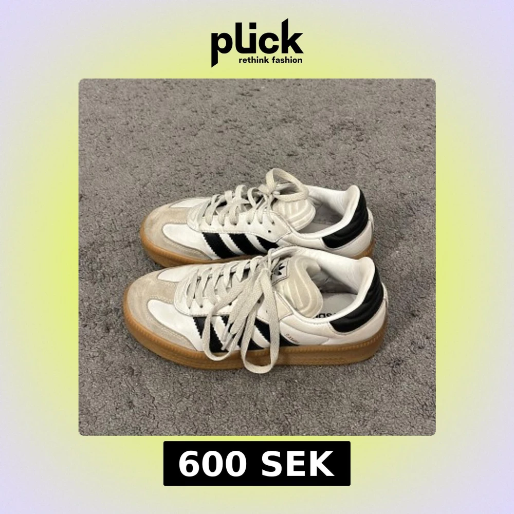 Klassiska Adidas Samba sneakers i vitt och svart med gummisula. Bra skick, har inte testat att göra rent dom. Kartongen är lite trasig, men inget fel på skorna