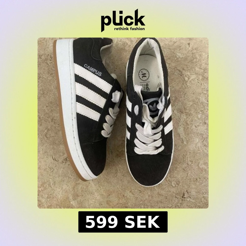 Svarta Adidas Campus sneakers med klassiska vita ränder på sidorna och vit sula. Skorna har rund tå, platt sula och snörning med breda vita skosnören. Ovandelen är i mocka och insidan är vit med Adidas-logga. Perfekt för dig som gillar retrostil.