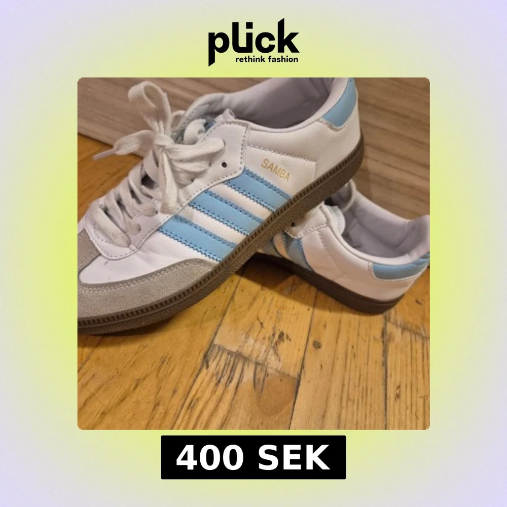 Säljer ett par Adidas Samba sneakers i vitt/ ljusblått. Dem är typ använda 2-4 gngr, och även bra passform✅️