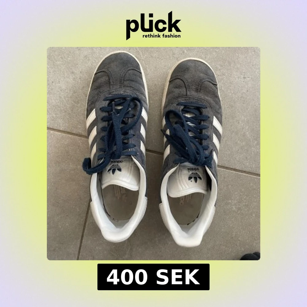 Säljer ett par klassiska Adidas Gazelle sneakers i mörkblå mocka med vita detaljer, lite slitnare färgen men annars hela.