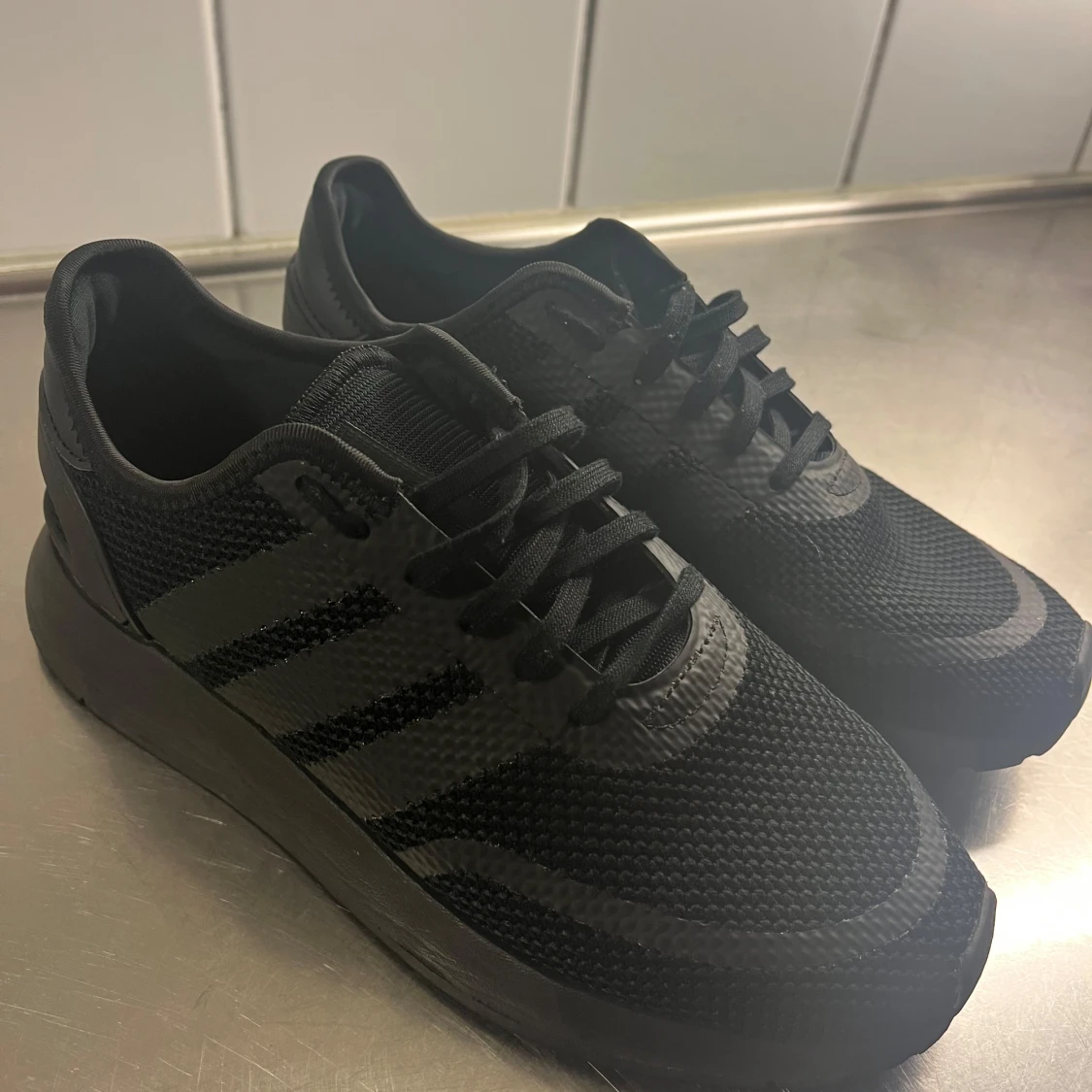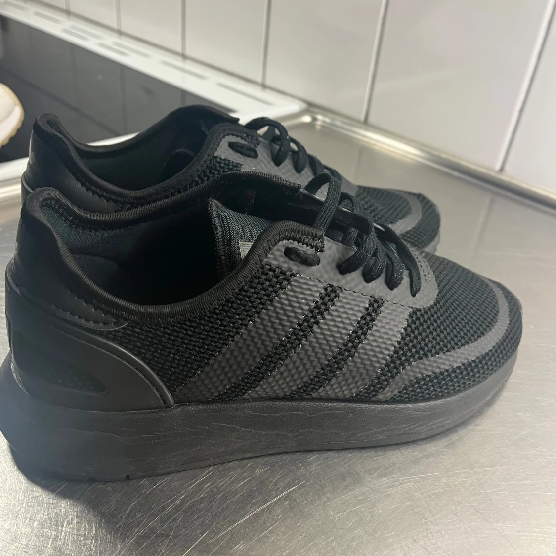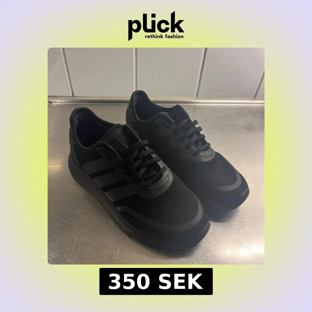 Säljer ett par helsvarta Adidas sneakers med klassiska tre ränder på sidan. Skorna har ovandel i mesh och syntet, snörning och platt sula. Perfekta för dig som gillar en clean och sportig look.