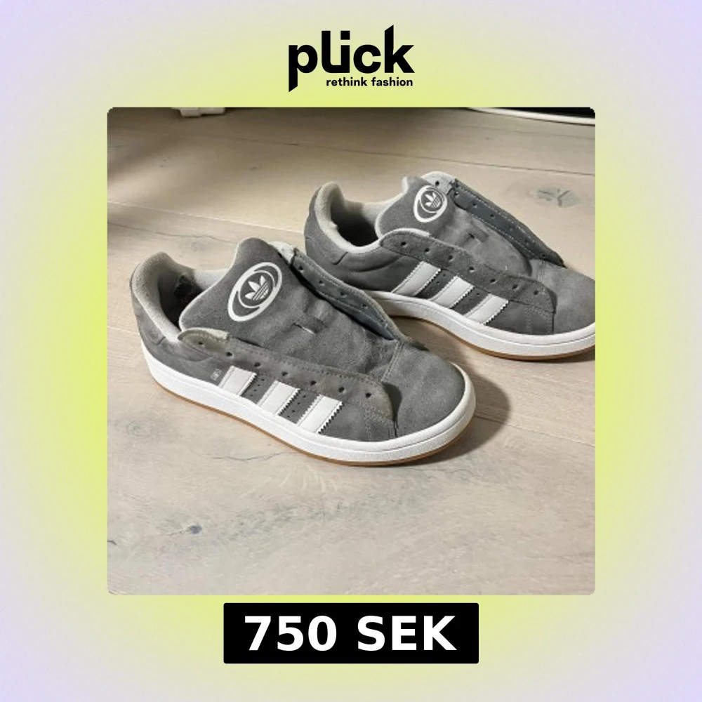 SNÖREN GÅR MED I KÖPET. Har haft skorna i ett år. Säljer ett par grå Adidas campus sneakers med vita detaljer och den klassiska trefoil-loggan. Skorna har en stilren design med tre vita ränder på sidan och en bekväm innersula. Perfekta för en avslappnad stil.