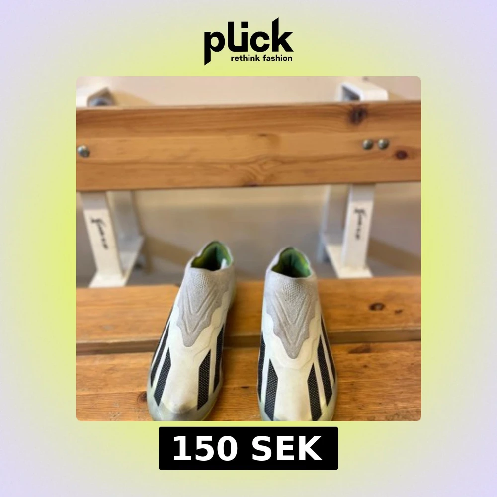 Säljer ett par Adidas fotbollsskor i grått och svart med neongul sula. Skorna har en strömlinjeformad design utan snörning och är perfekta för dig som vill ha stilrena och lätta skor på planen.