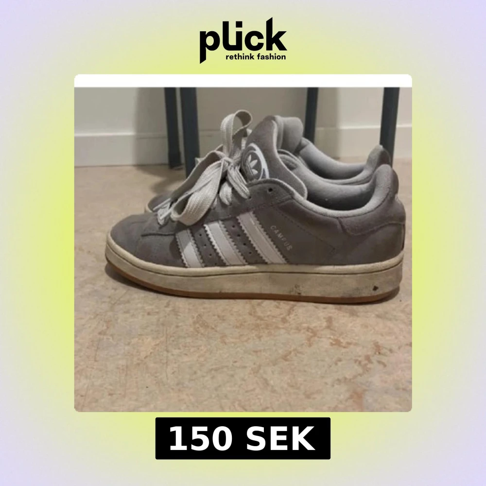 Säljer ett par grå Adidas Campus sneakers med klassiska vita ränder på sidan och vit logga på plösen. Skorna har rund tå, platt sula och är tillverkade i mocka med snörning framtill. Perfekt för dig som gillar retrostil och streetwear.