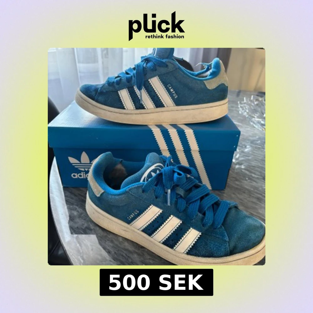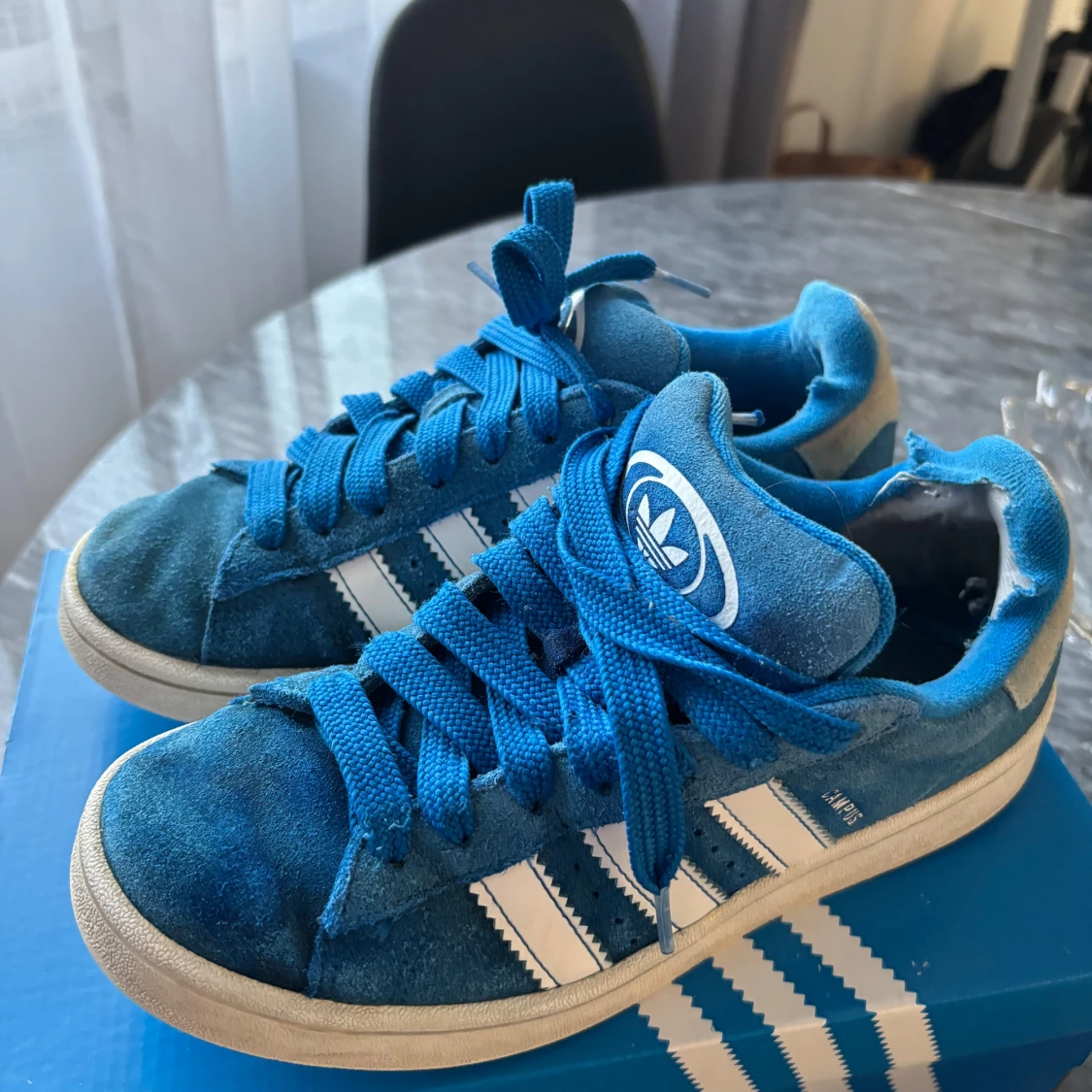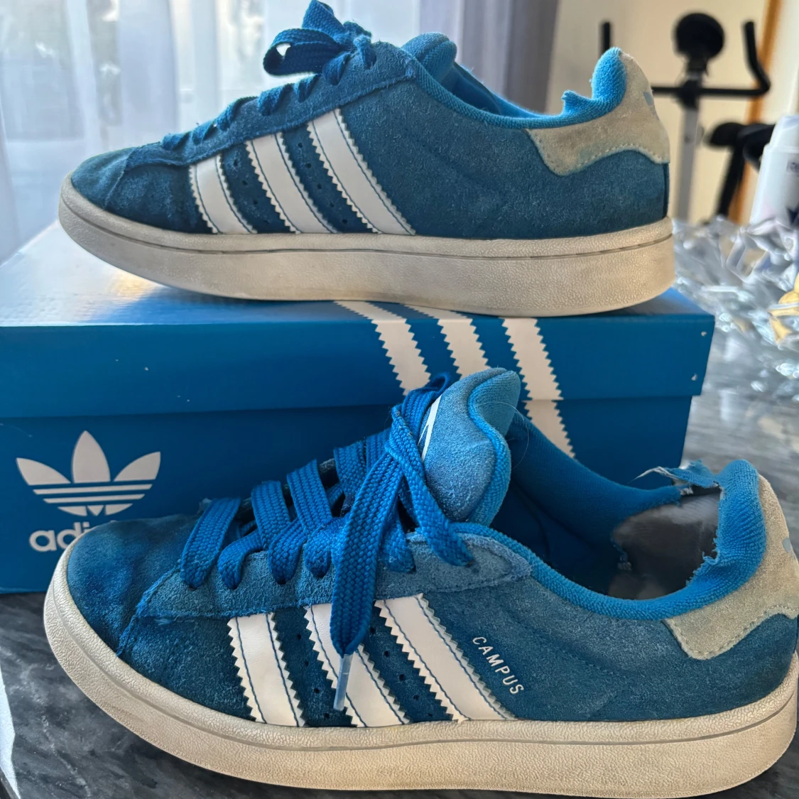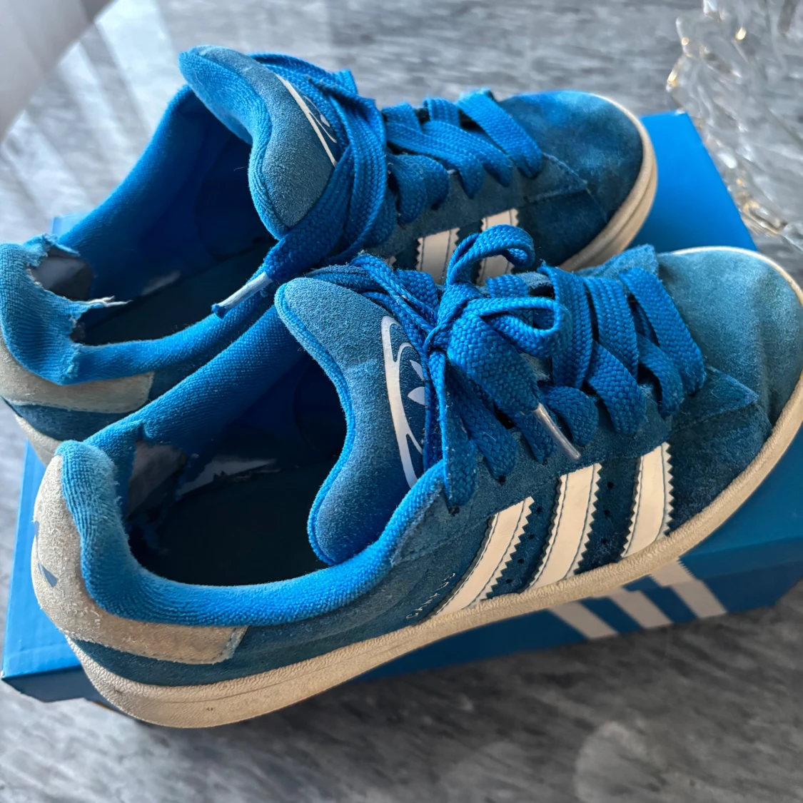 Snygga blå Adidas Campus sneakers med vita detaljer och klassiska tre ränder på sidan. Skorna har en bekväm passform och är perfekta för en avslappnad stil. De är tillverkade i mocka och har snörning framtill.