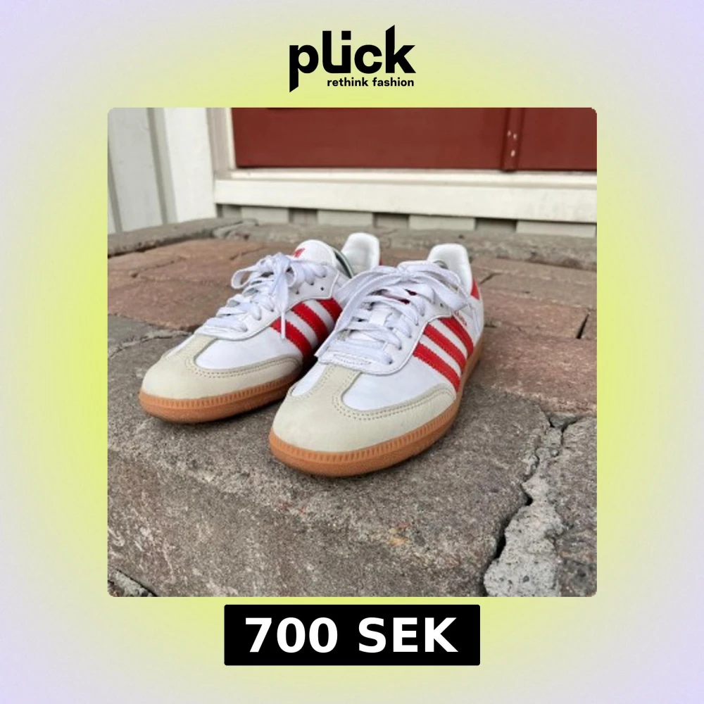 Säljer ett par Adidas Samba sneakers i vitt skinn med röda detaljer och ränder. Skorna har den klassiska gummisulans design, snörning och beige mockadetaljer vid tån, vilket ger dem en tidlös retrolook. De är i mycket bra skick, nästan som nya, och har bara använts ett fåtal gånger. Storleken är 39,5. Ett perfekt val för dig som vill ha ett par stiliga och sportiga sneakers med både komfort och klass. Passar lika bra till vardags som till mer avslappnade tillfällen.