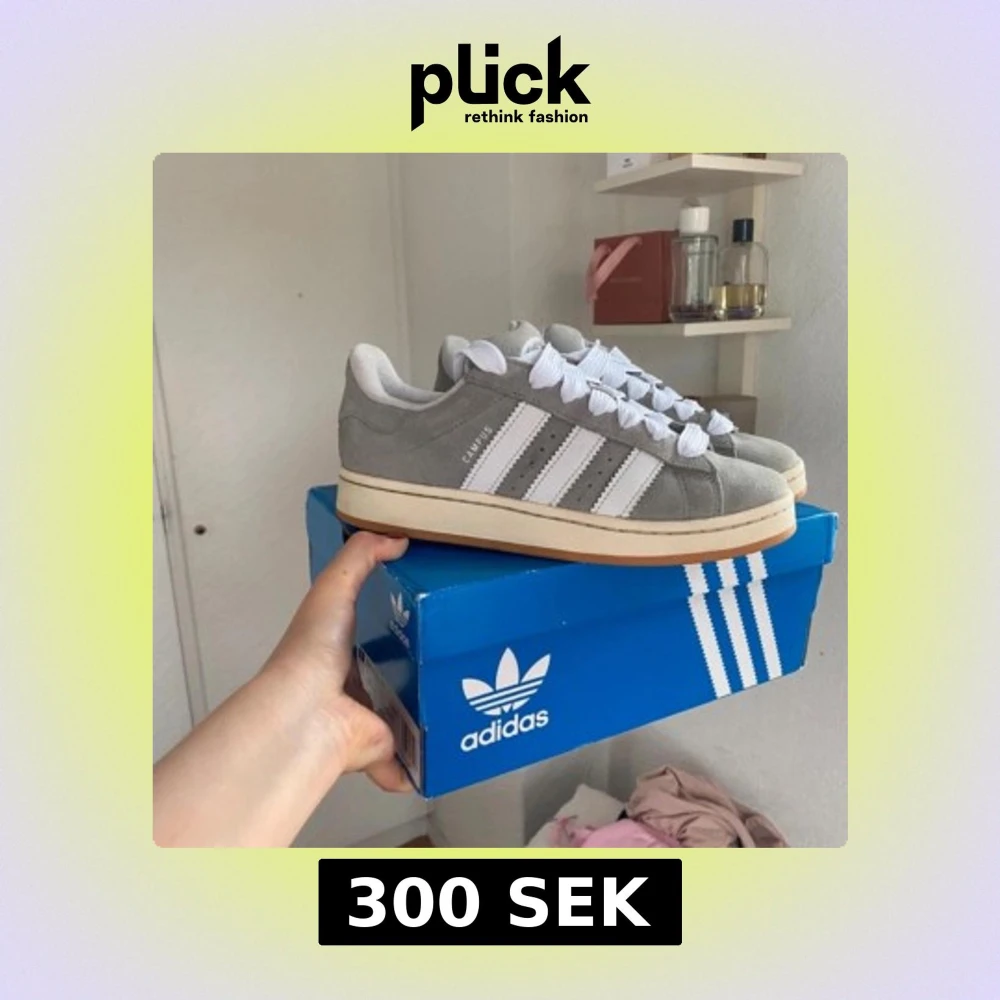 Snygga Adidas Campus sneakers i grå mocka med klassiska vita ränder på sidorna och vit sula med beige kant. Skorna har rund tå, platt sula och breda vita snören. Perfekta för en clean och stilren look.