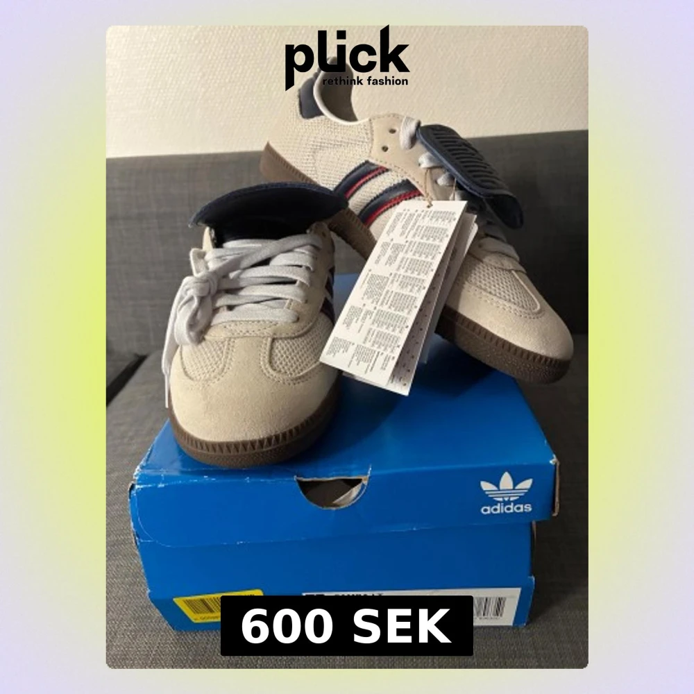 Helt nya Adidas Samba LT sneakers i beige med klassiska mörkblå och röda ränder på sidan. Skorna har vit snörning, brun platt sula och en mix av mocka och mesh-material på ovandelen. Ikonisk retrostil med rund tå och detaljer i guld vid loggan.