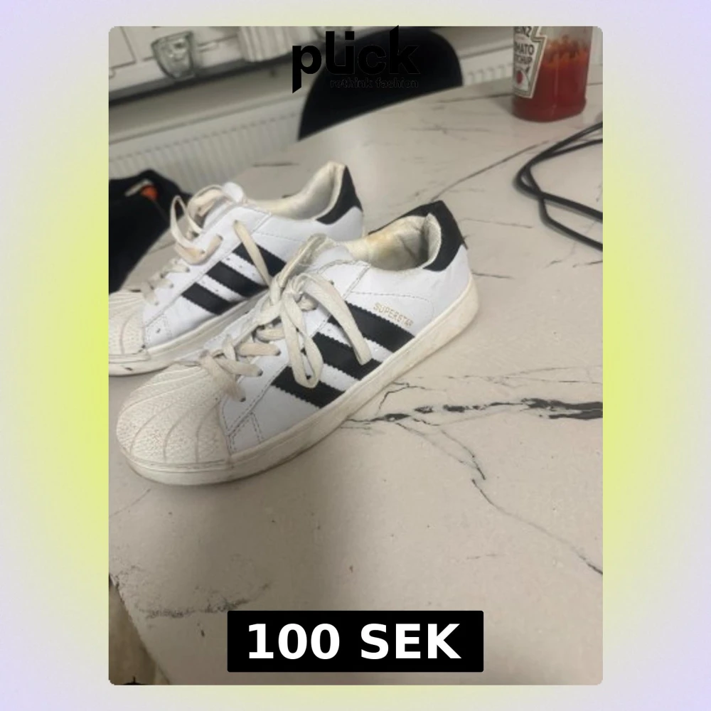 Klassiska Adidas Superstar sneakers i vitt med svarta ränder och guldtext på sidan. Skorna har snörning, platt sula och den ikoniska rundade tån med mönstrad gummidetalj. Tillverkade i skinn och syntetmaterial, passar perfekt för dig som gillar retrostil.