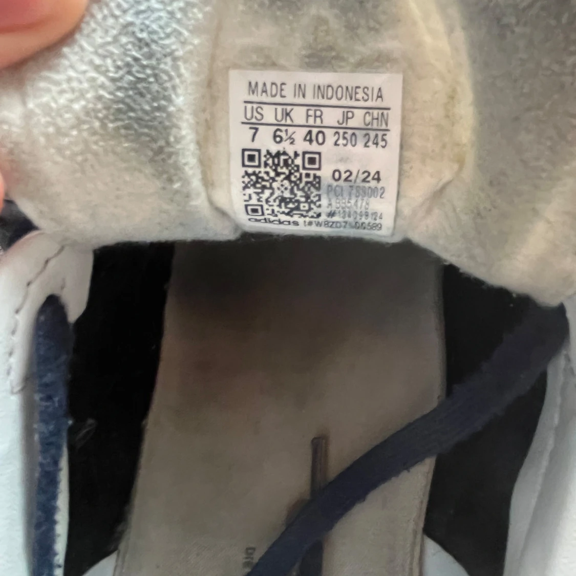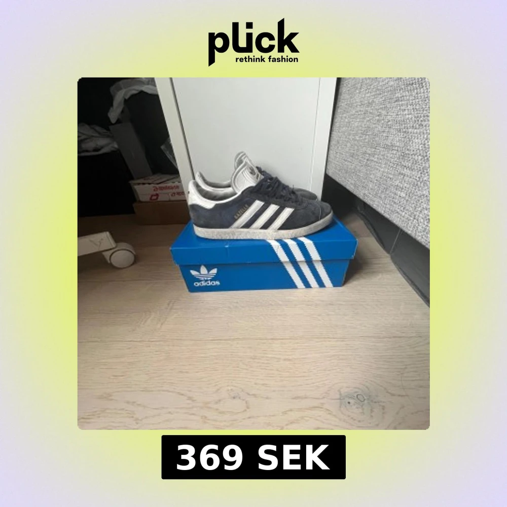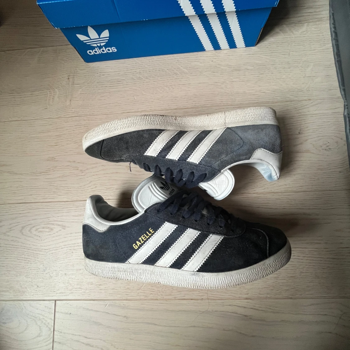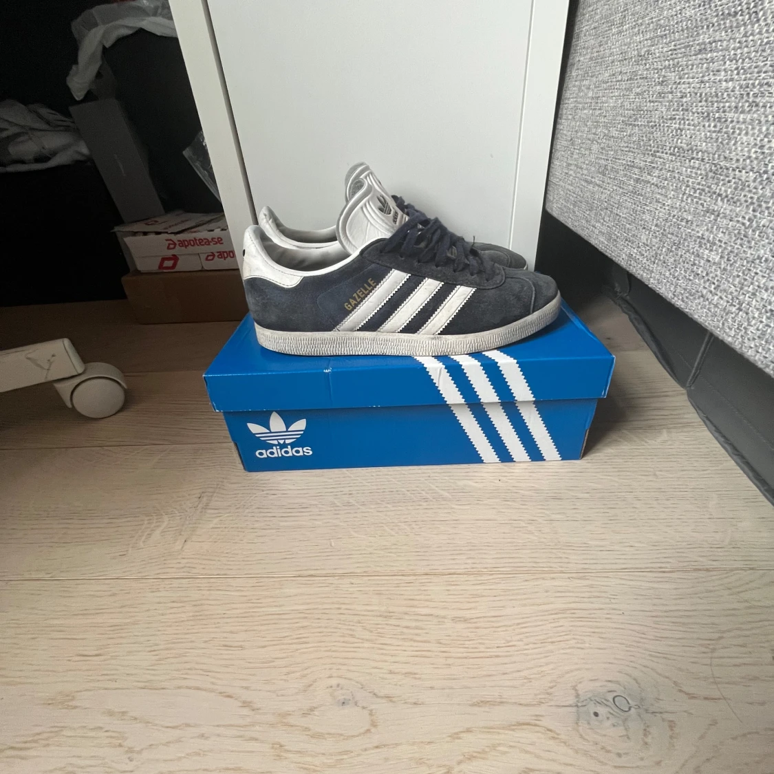 Säljer ett par klassiska Adidas Gazelle sneakers i marinblå mocka med vita detaljer och de ikoniska tre ränderna på sidan. Skorna har snörning och platt sula, samt diskret guldfärgad Gazelle-text på sidan. Perfekta för en stilren och sportig look.