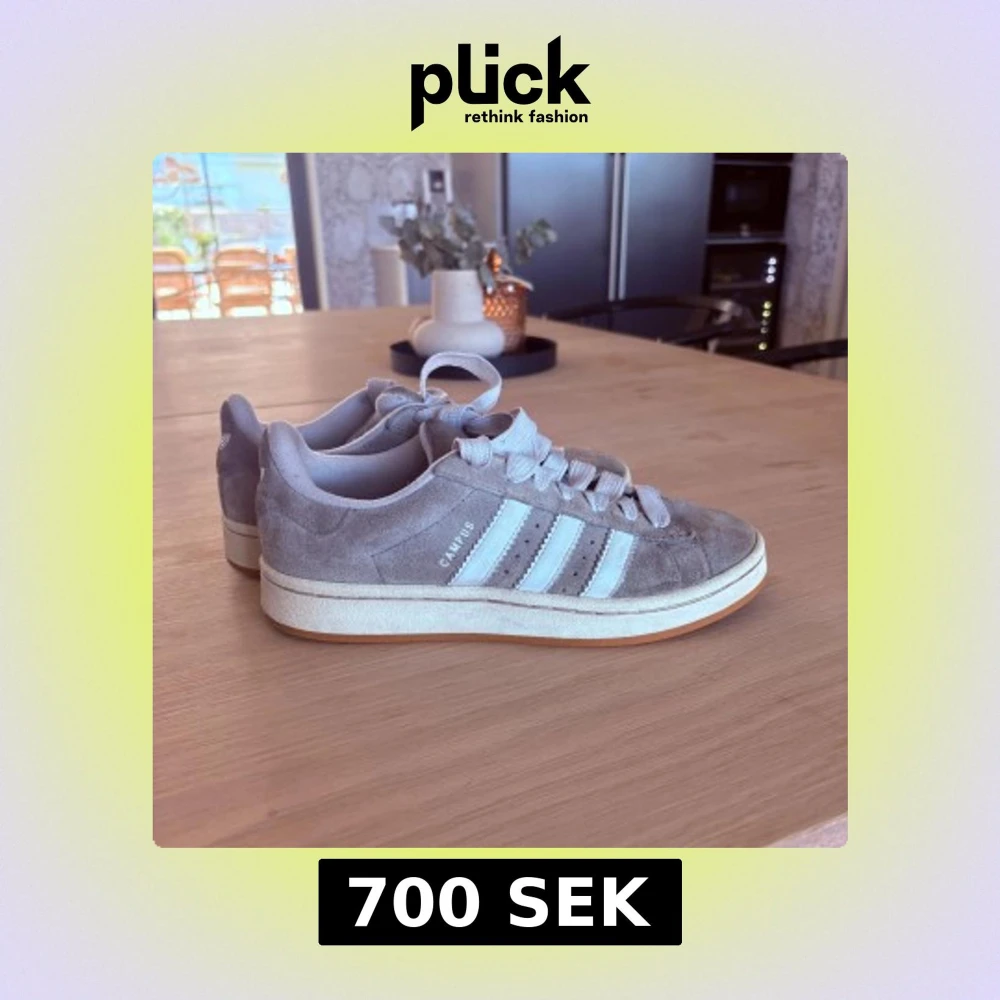 Snygga Adidas Campus sneakers i grå mocka med klassiska vita ränder och vit sula. Skorna har rund tå, platt sula och breda vita skosnören. Säljer då jag inte använder dessa längre.