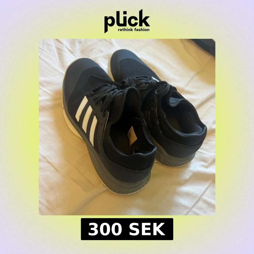 Svarta Adidas sneakers med klassiska vita ränder på sidorna och grå detaljer vid sulan. Ovandelen är i mesh och syntet, vilket ger en sportig vibe. Skorna har snörning och en platt sula som passar perfekt till en aktiv sport, har använts till innebandy.
