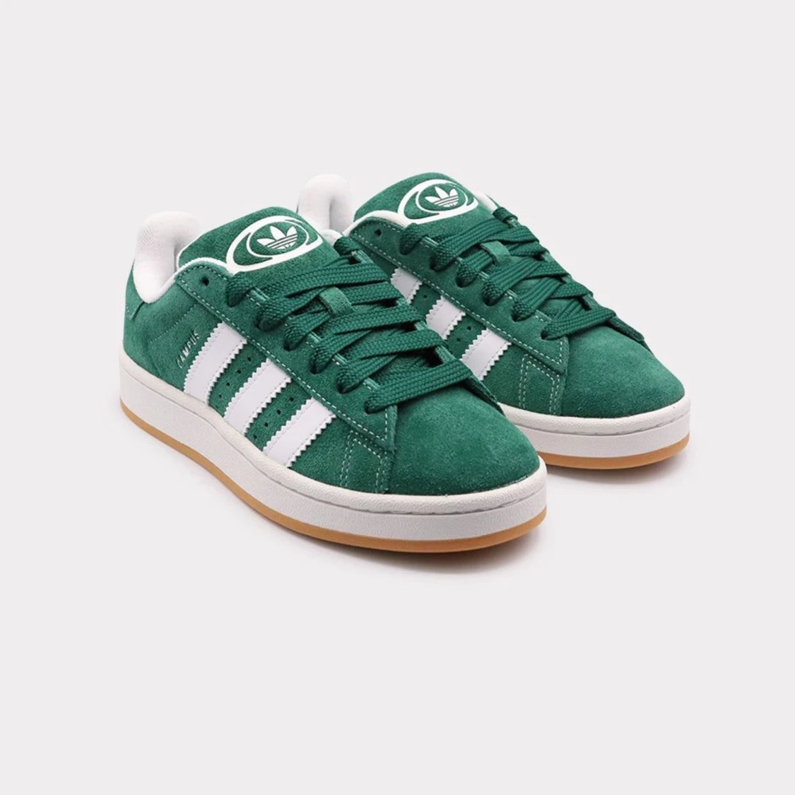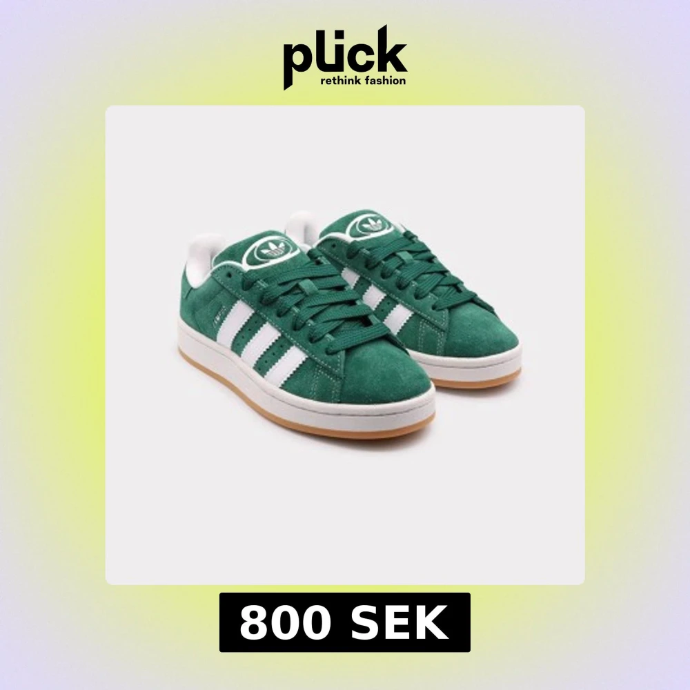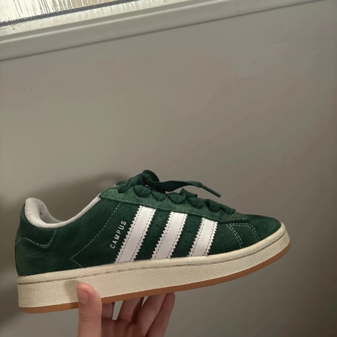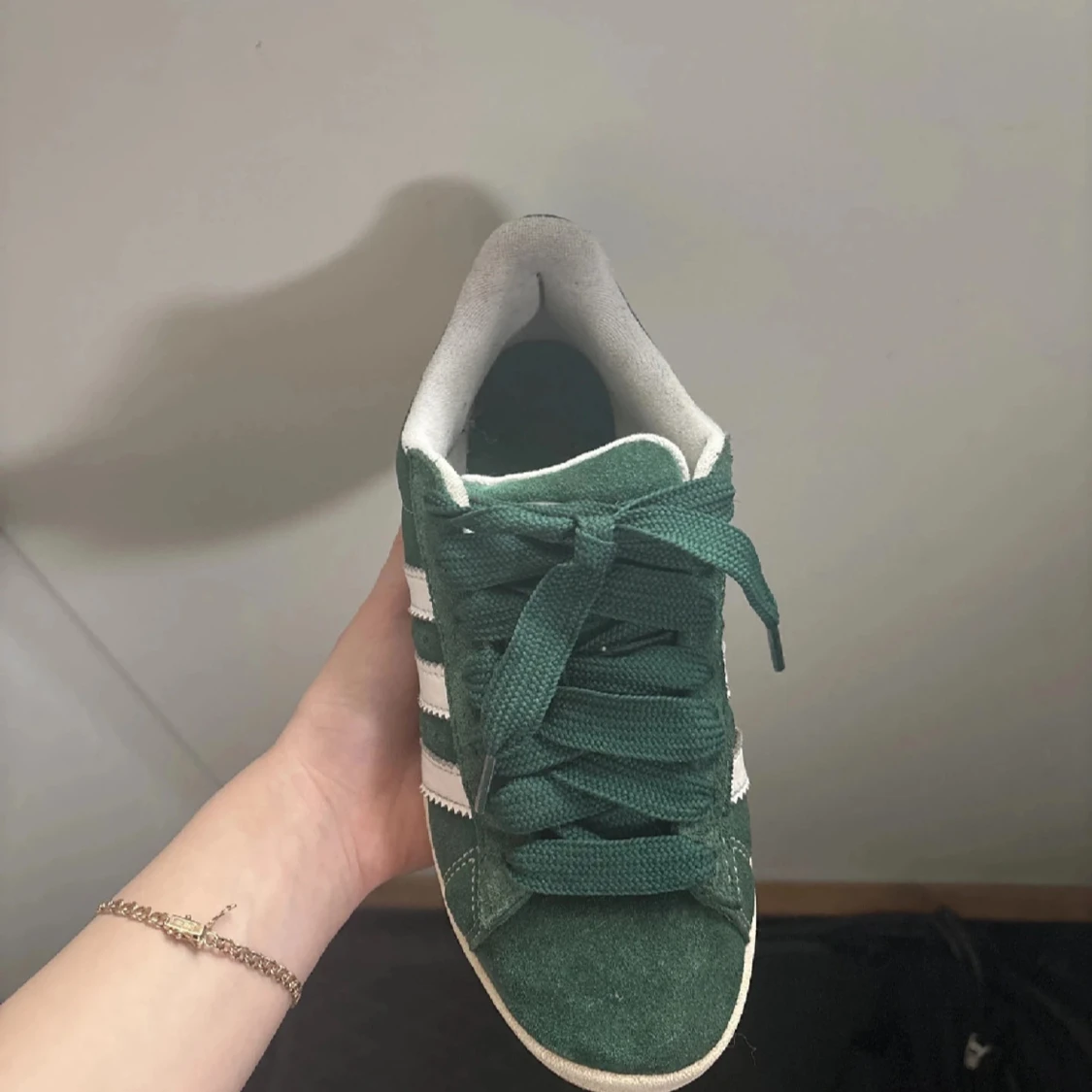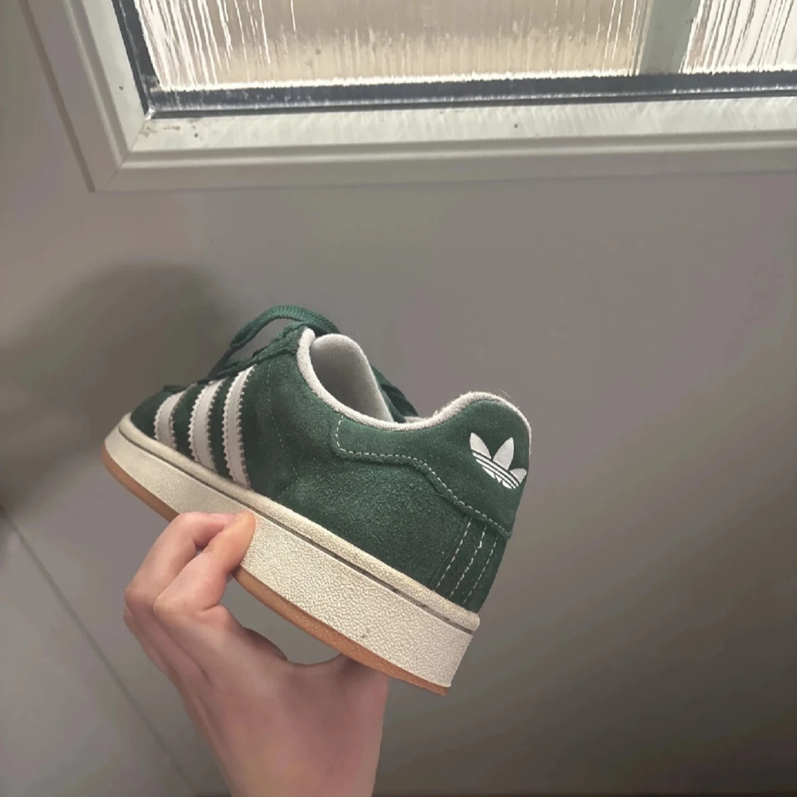 Snygga gröna Adidas sneakers i mocka med vita detaljer och klassiska tre ränder. Skorna har en gummisula och snörning för en bekväm passform. Perfekta för en stilren och sportig look.‼️pris kan diskuteras‼️