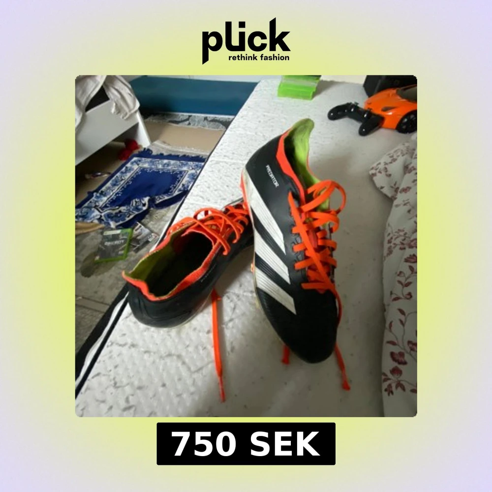 Säljer ett par Adidas Predator fotbollsskor i svart med vita ränder och orange snörning. Skorna har dobbar för spel på gräs och en grön insida. Perfekta för dig som vill sticka ut på planen!