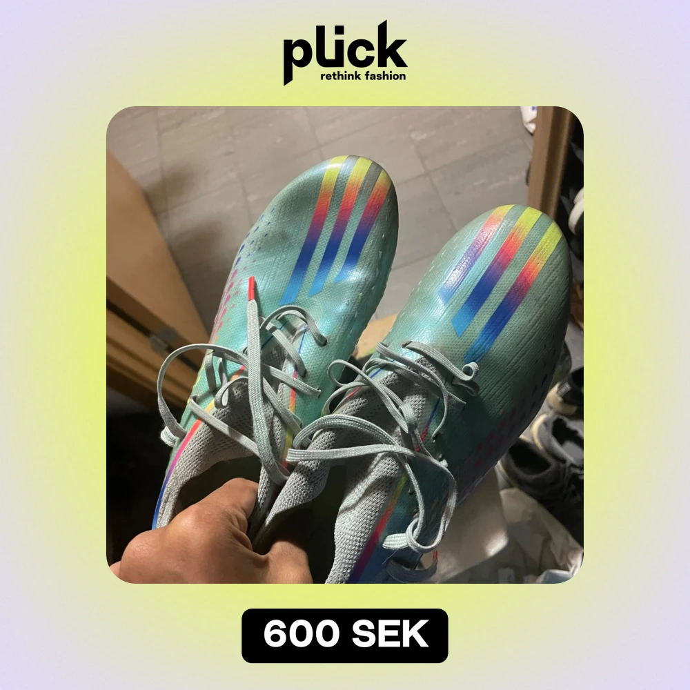 Säljer ett par coola fotbollsskor från Adidas i regnbågsfärger. Skorna har en snygg design med blå, rosa och gula detaljer och är perfekta för fotbollsplanen. De har snörning för bra passform och är i bra skick. Perfekta för dig som vill sticka ut på planen!